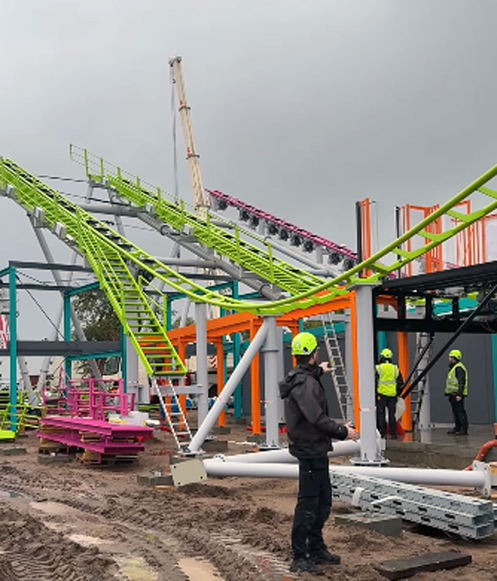 Aktuell befindet sich die doppelte Strecke in peppigen Farben im Bau – es geht sowohl 16,5 Meter in die Höhe als auch ein wenig in die Tiefe. Ob es einen kurzen „Dark Ride“, sprich einen Streckenabschnitt im Dunkeln geben wird, kann aktuell noch nicht gesagt werden. Das Thema werden wir dann noch… vertiefen.