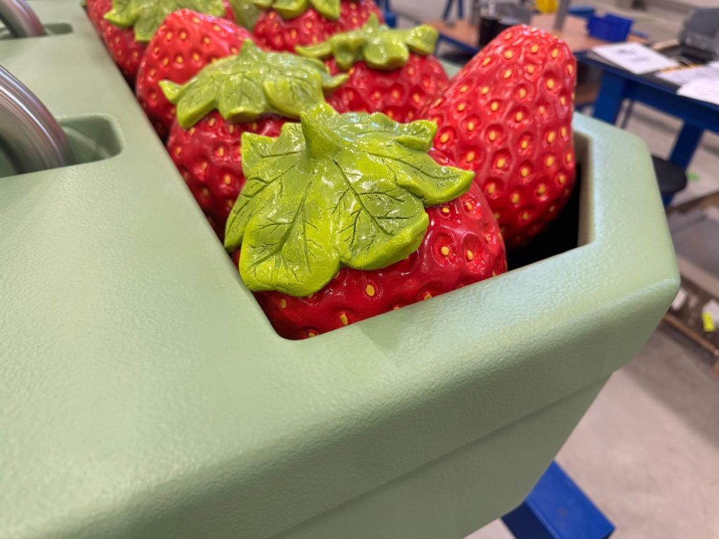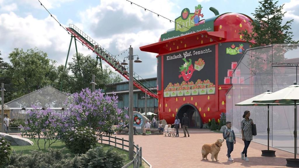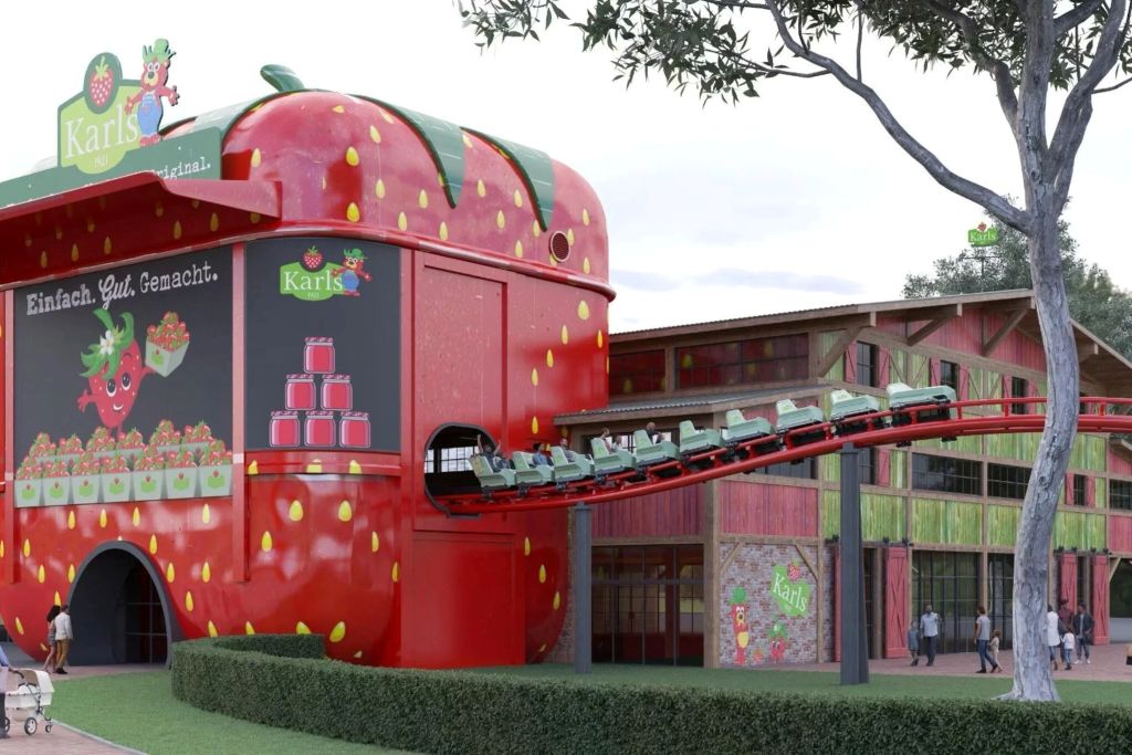 Die sogenannte Boomerang-Achterbahn 🔎 wird in einem riesigen Erdbeerstand betreten, in dem auch ein Erdbeer-Café Elisabeth Unterschlupf finden wird – Stichwort Erdbeerkuchen mit Sahne. Anschließend werden aneinandergereihte und überdimensionierte Erdbeerschälchen mit jeweils zwei Sitzen nebst wagemutigen Erdbeer-Freunden einen Anstieg rückwärts hochgezogen, ehe die Sause beginnt: Es geht in vollem Tempo hindurch durch den XXL-Erdbeerstand, immer munter hoch und runter, am Ende erneut hoch – und es erfolgt ein weiterer Start. Die gesamte Strecke wird nun rückwärts zurückgelegt.