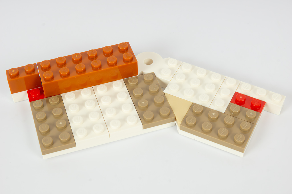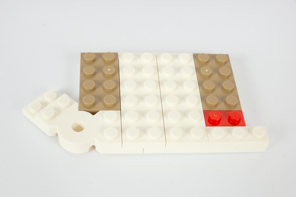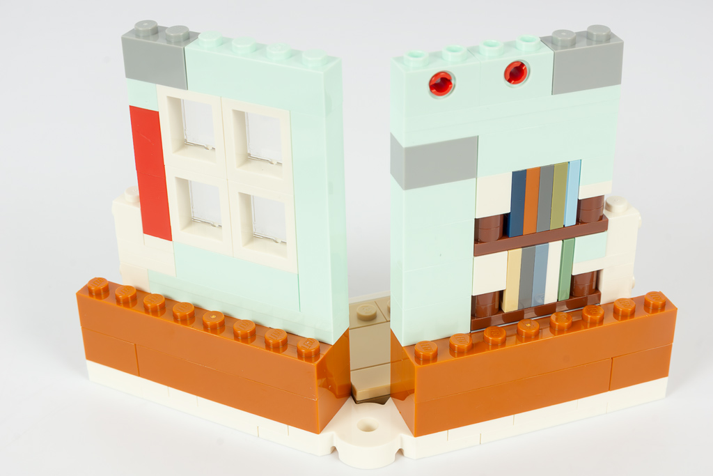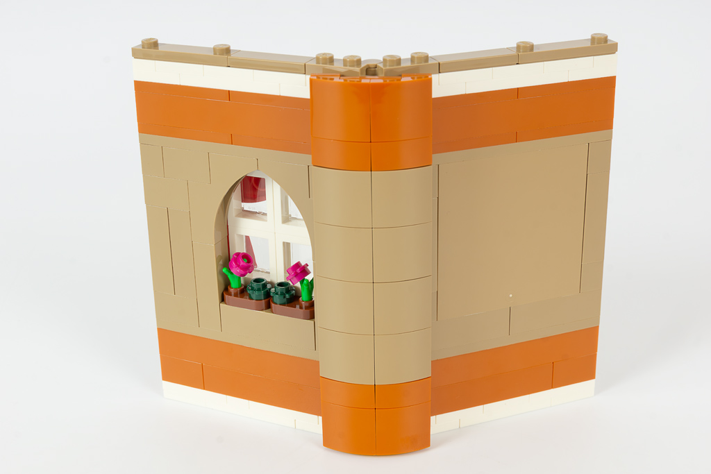 Den Hauptteil des Sets macht das Buch-Diorama aus, das gleich zu Beginn mit einer interessanten Bautechnik aufwartet: Eine modifizierte Platte (79846) in Weiß bietet die Möglichkeit, das Buch mit einem Öffnungswinkel von 135 Grad zu bauen, was viel besser wirkt als ein eventuelles lineares Layout.