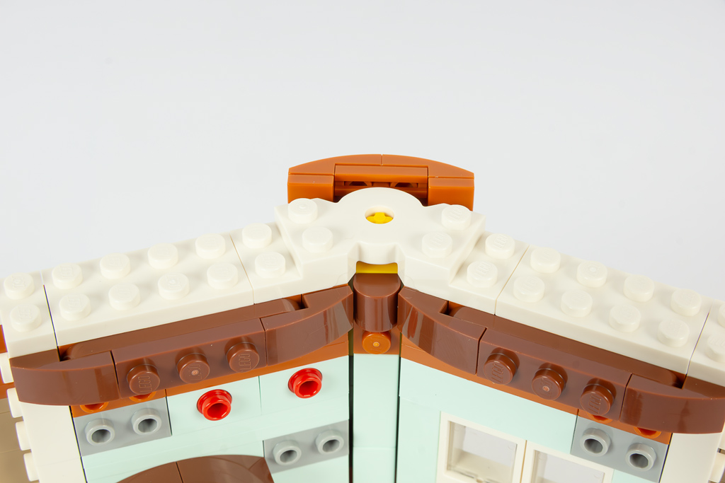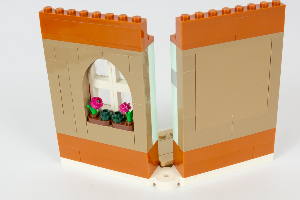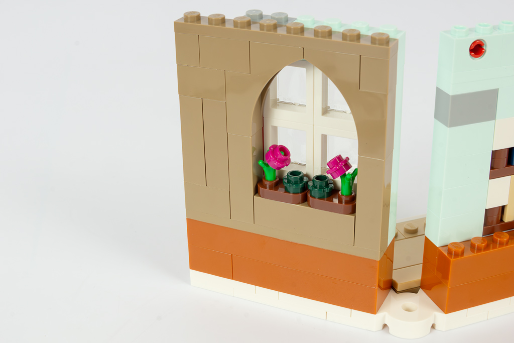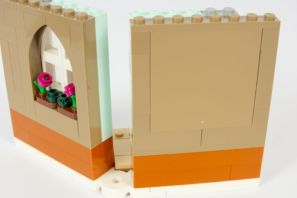 Die Rückseite, die LEGO auf den offiziellen Produktbildern nicht hat zeigen wollen, ist aufgeräumt, klar, und farblich ansprechend. Davon kann sich der 75419 Todesstern mal eine gewaltige Scheibe abschneiden! (Kugelt ihr euch schon vor Lachen bei dem Gedanken, dass Jane Austen Darth Vader etwas voraushat?) Auch der kleine Blumenkasten vor dem Fenster gefällt mir, nicht minder der Spitzbogen (13965) davor.