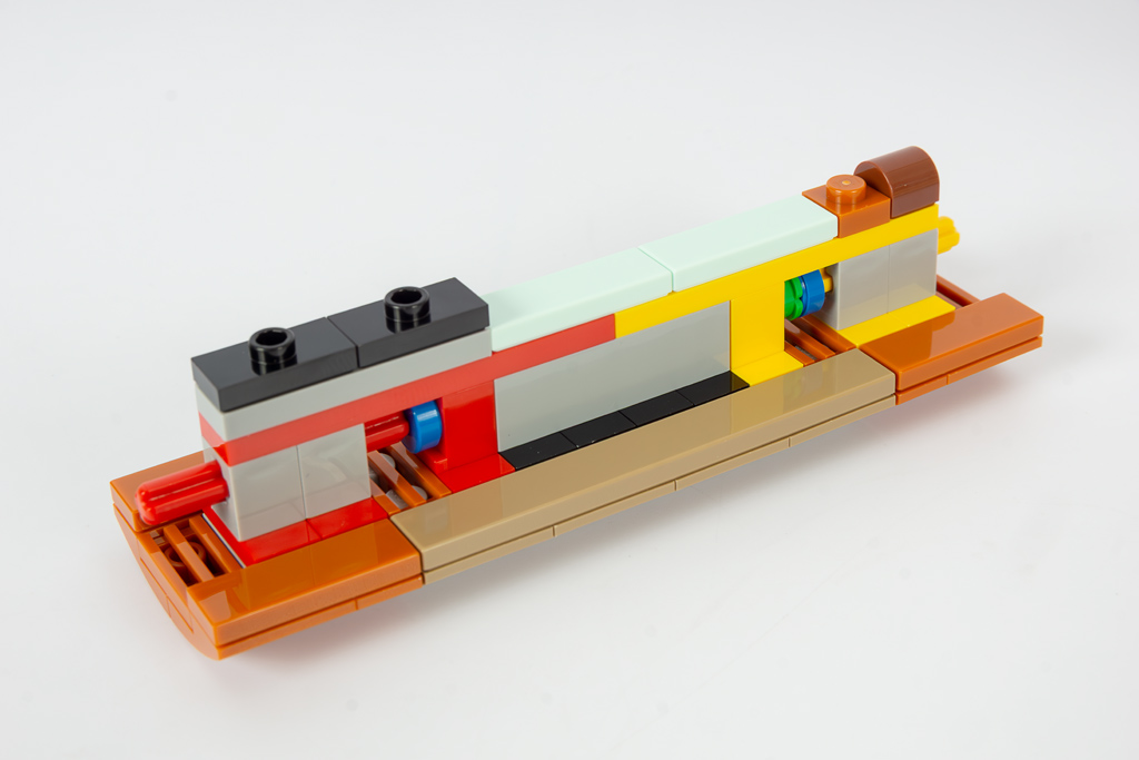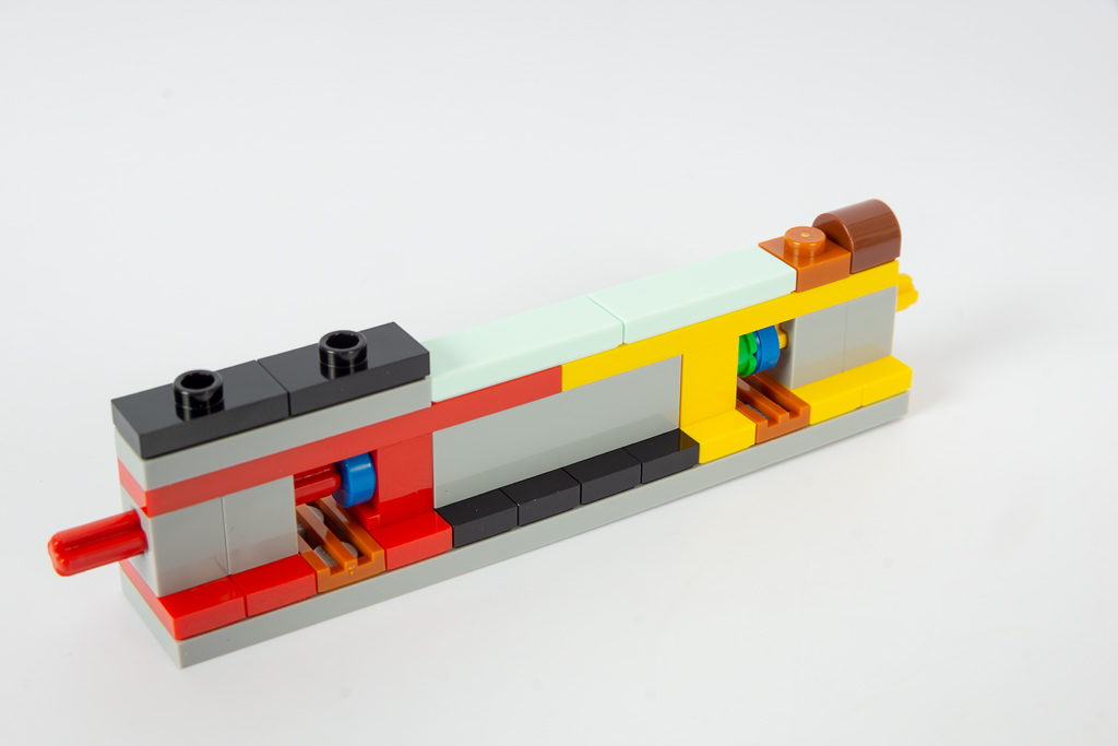Was wir hier aufs Schönste sehen: Eine abenteuerliche Konstruktion bildet den Buchrücken. Um in der Anleitung die Polarität des Teils nach dem Einsetzen in das Buch sichtbar zu machen, ist ein Ende rot, das andere gelb gehalten. Korrekt positionierte blaue Rundkacheln (98138) definieren, wie weit die rote 4L- (3705) und die gelbe 3L-Achse (4519) herausstehen müssen (drei beziehungsweise zwei Plattenhöhen).