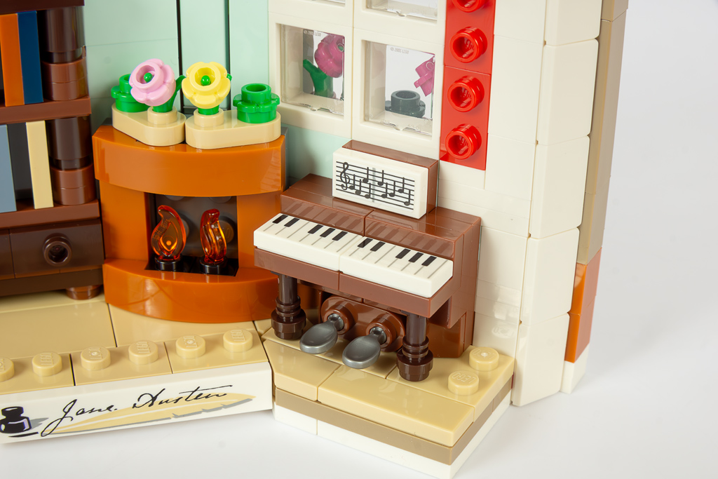 Während das Modell nicht riesig ist, so ist es doch vollgepackt mit Details, die Jane Austens gemütliche Schreibstube zeigen. Ein Bücherregal, ein Kamin, um überschüssige Bücher loszuwerden (Tolstoi? Kenne ich nicht, weg damit! Wells? Was, Zeitmaschine? So ein Humbug!), ein Klavier… Wirklich gelungen!
