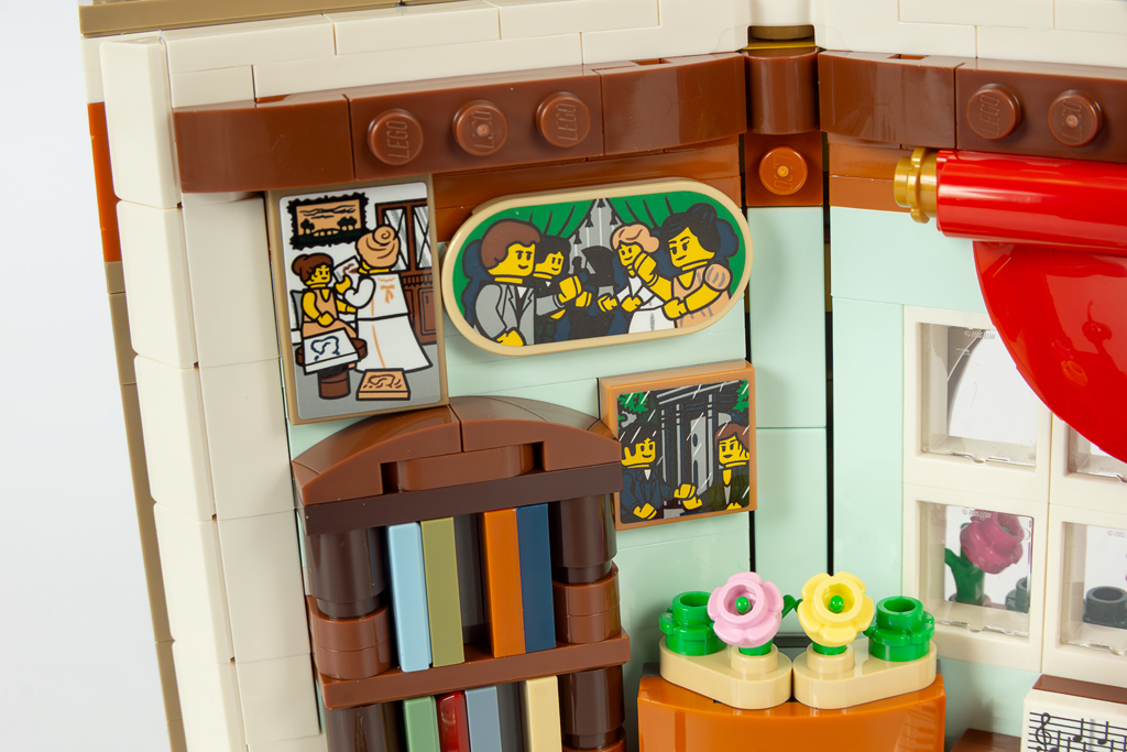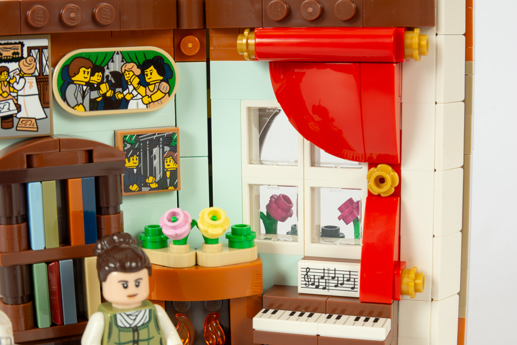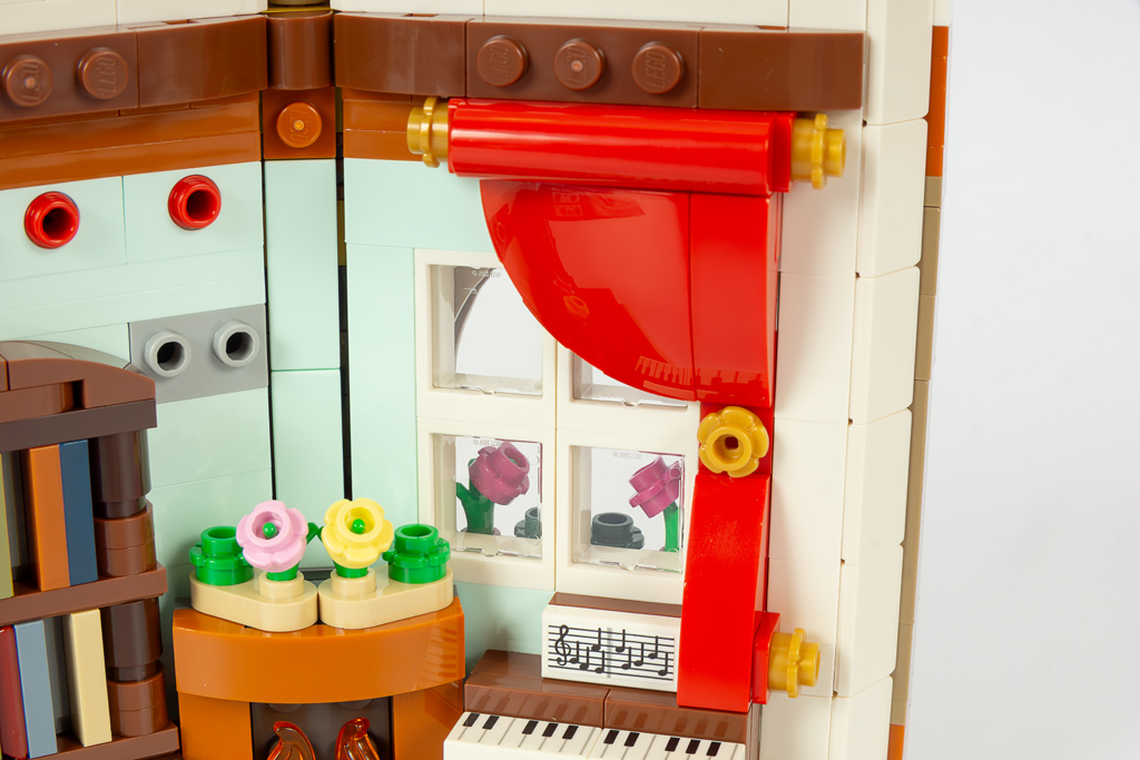 Wo wir gerade bei schöner Einrichtung sind: Auch das Klavier und der Vorhang sind schön umgesetzt, das Klavier mit Löffelpedalen (80179) und bedruckten Tasten (3069pb0761), der Vorhang mit roten Curved Slopes (50950/76797/79756). Letzteres Element ist neu in Rot und bisher exklusiv in diesem Set enthalten, aber vermutlich nicht dafür ins Sortiment genommen worden – stattdessen dürfte es in einem zukünftigen, größeren Set genutzt werden. Einziger Wermutstropfen an dem Klavier ist hier, dass das Notenblatt ein Sticker ist, statt eines bedruckten Elementes aus einem potentiellen anderen Set.