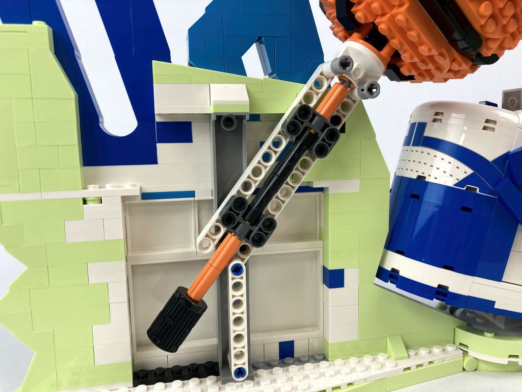 Der Basketball ist auf einer kleinen, auf der Rückseite des Schriftzugs angebrachten Technic-Konstruktion montiert. Dreht man an der Achse, dreht sich der Ball. Das ist etwas… nun ja… ich weiß nicht so recht, wie ich das einordnen soll. Ist schon nett, aber ich kann mir kaum vorstellen, dass man vor dem Modell sitzt und um des Effekts willen regelmäßig dem Ball den „perfekten Spin“ (wie es in der LEGO Beschreibung heißt) verpasst. Außer mal zum Ausprobieren. Wie ich im Rahmen des Reviews.