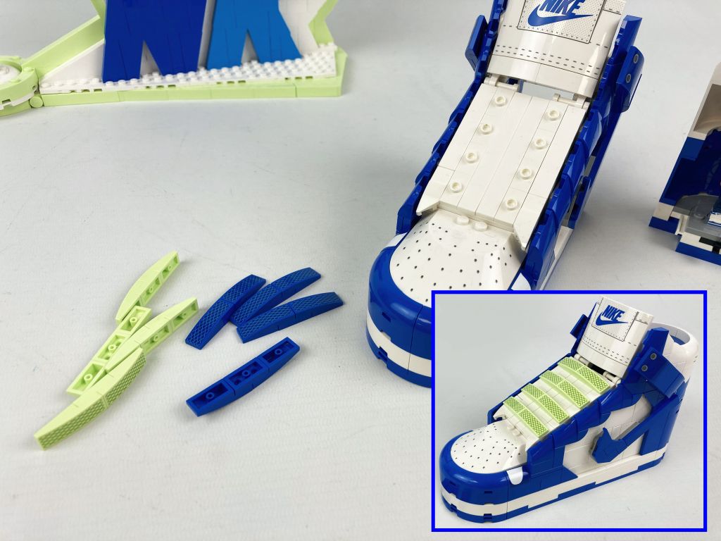 Drei Anleitungen sind vorhanden, mit denen jeweils unabhängig voneinander der Schuh (104 Seiten), der Schriftzug (136 Seiten und großformatiger) und der Basketball (44 Seiten) aufgebaut werden können. 20 Aufkleber kommen zum Einsatz, davon 16 für die Schnürsenkelbausteine.