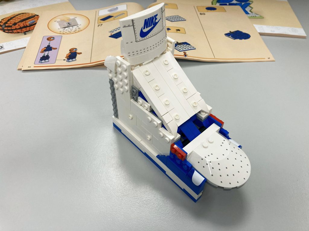 Der Schuhaufbau ist in drei Bauabschnitte unterteilt. Der Schriftzug ist mit vier Abschnitten am umfangreichsten, den Basketball hat man nach drei weiteren Bauabschnitten in Händen.