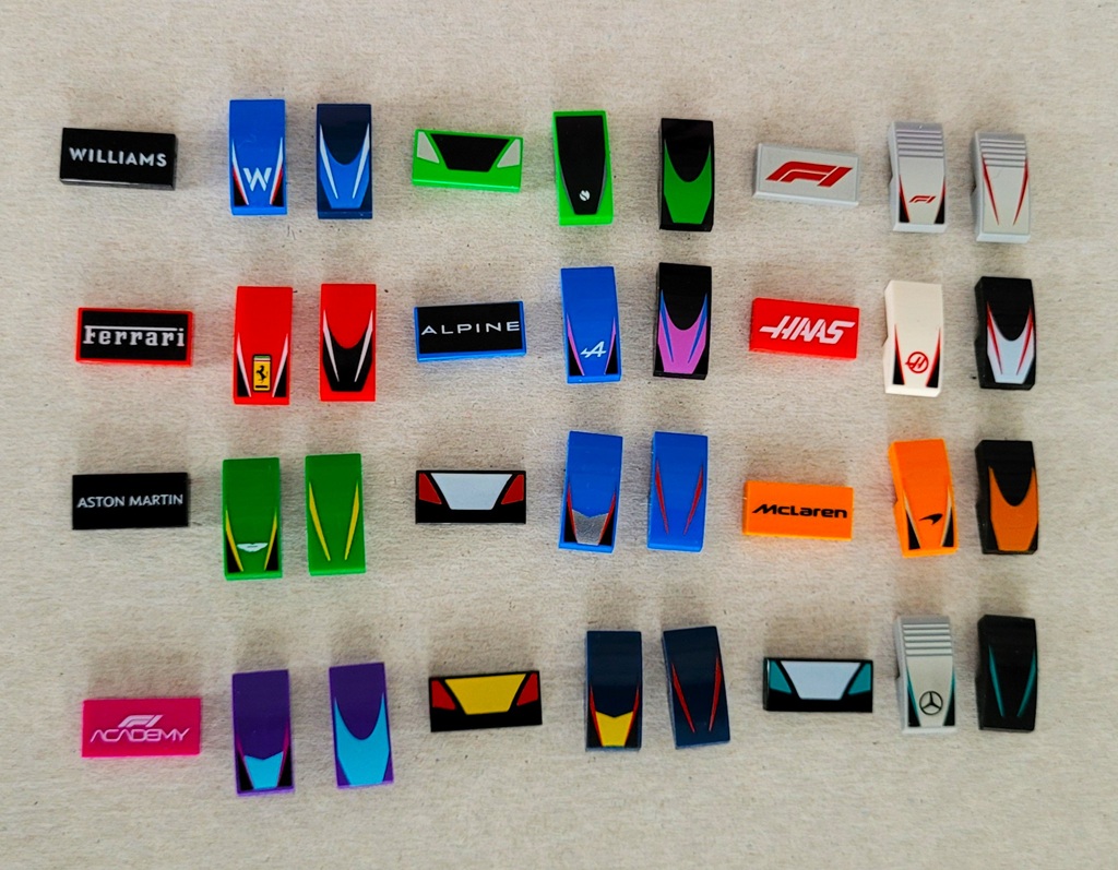 Zweite lustige Auffälligkeit ist, dass manche Wagen wie z.B. die von Redbull gesponsorten Teams, nicht mit dem Logo des Sponsors versehen sind. Soweit ich feststellen konnte betrifft dies die Wagen deren Sponsoren Energy-Drinks oder Glücksspiel-Marken sind. Ich schätze, dass es sich hier um Richtlinien für Spielzeughersteller handelt, welche diese Themen nicht in ihren Sets für Altersgruppen unter 18 vermarkten dürfen. Auch im Speed Champions Segment sind z.B. die Redbull-Teams als 18+ Sets ausgewiesen, während andere Wagen niedrigere Altersempfehlungen haben. Es hätte natürlich keinen Sinn gemacht diese Sammelrennwagen mit 18+ auszuweisen und damit können wir uns nun die Fahrzeuge anschauen.