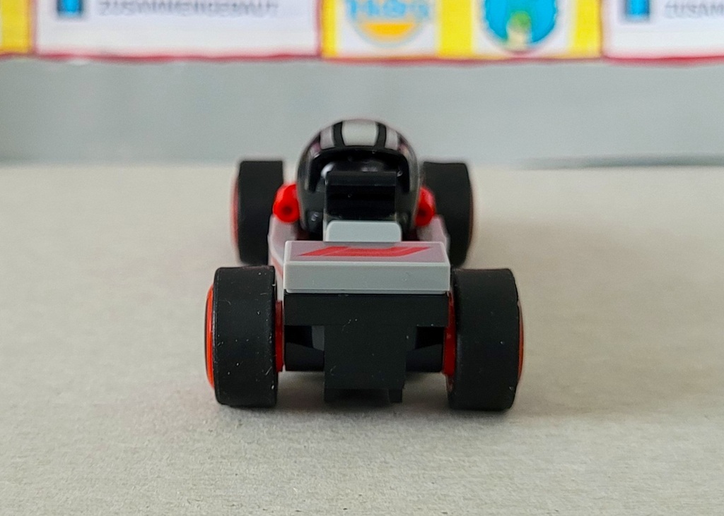 Die Fahrzeugbasis ist ein Formteil, welches mit seinen seltsamen Proportionen und vielen interessanten Verbindungsmöglichkeiten für Achspins und Noppen doch stark an die frühen 2000er erinnert. Oder um präzise zu sein: Dieses Element erinnert mich an die Roboter-Elemente aus Alpha Team: Mission Deep Sea. An dieses Teil werden dann die Räder und allerlei kleine Elemente angebracht und schon entsteht ein kleines F1 Autochen.