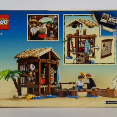 Die Verpackung ist schön gestaltet. Passend zum Titel des Sets sind im Hintergrund die Windmühlen zu sehen. Die Hütte selbst ist am Wasser gebaut und das Boot darf auf den Wellen tanzen. Wie bei Sets zu Filmen oder Serien ist eine Referenz auf der Schachtel aufgedruckt. Bei One Piece ist es Ruffy. Auf der Rückseite sieht man die Funktionen des Sets und einen Hinweis auf die Sammelfliesen.