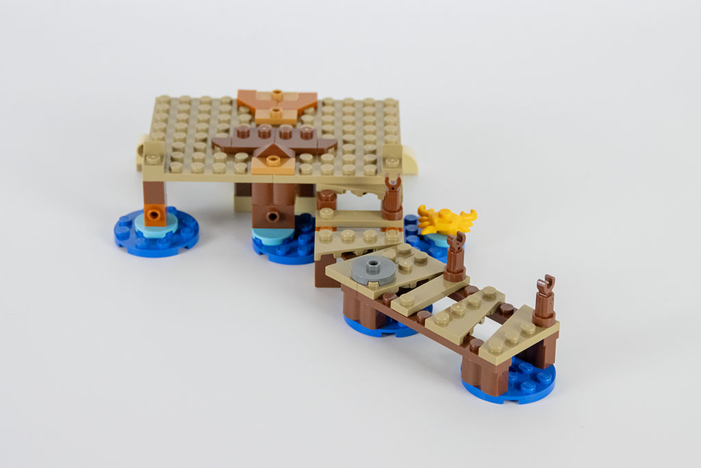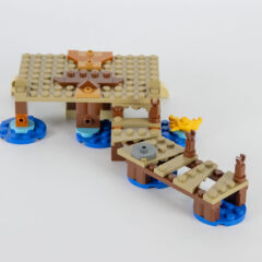 Das erste Set zur Serie ist wie gewohnt klein und schnell gebaut. Da gibt es dann auch nicht so viel, was man dazu schreiben kann. In drei Bauabschnitten wird die Hütte mit dem Anlegesteg gebaut. Das Dach kann abgenommen werden, was das Bespielen erleichtert. Sowohl die Hütte als auch der Steg haben ausreichend Details (Flaschen und Gläser im Regal, Stühle, Geländer, Krabbe, Surfbrett, Palme), dass das Set nicht langweilig wirkt und man schön damit spielen kann. Außerdem gibt es noch das kleine Boot, das am Steg befestigt werden kann. Es ist ein solides kleines Set, das gut zur Serienvorlage passt.