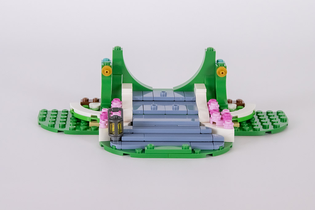 Im ersten Abschnitt werden die Treppe und die seitlichen Ausleger gebaut. Die Treppe ist mit reichlich rosa Blumen verziert.