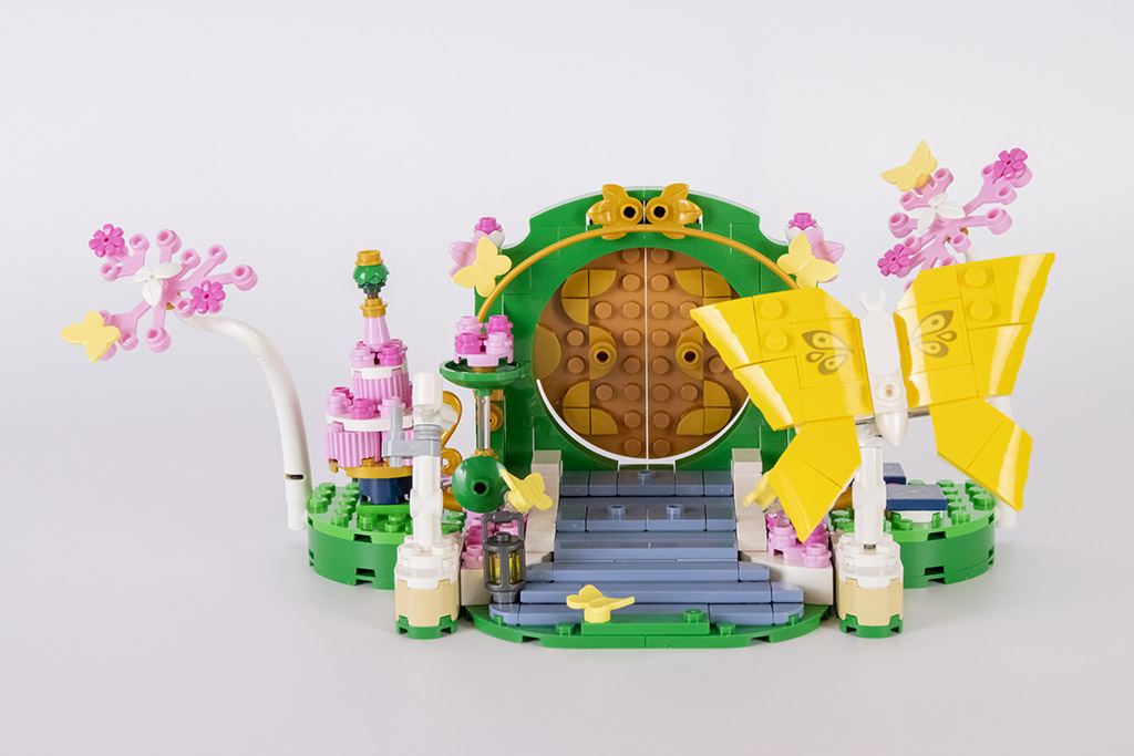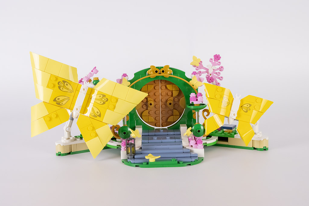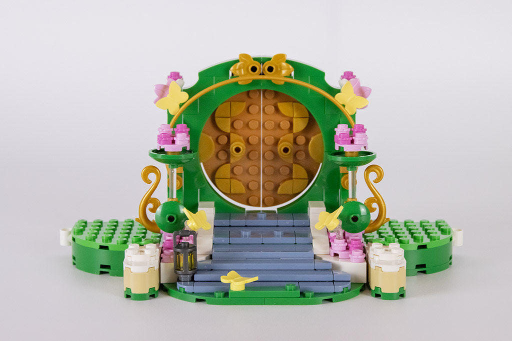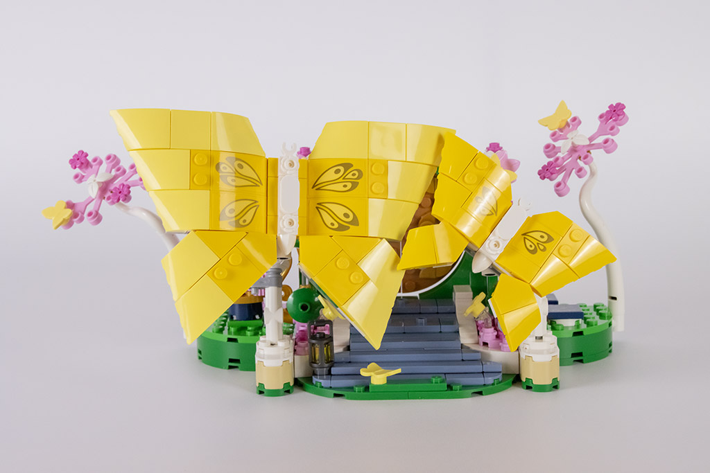 Wie schon gesagt – den Bezug zum Film kann ich nicht beurteilen. Meine ganz persönliche Meinung ist „was für ein Kitsch“! Tut mir leid, aber ich kann mit solchen klischeehaften Sets echt nichts anfangen. Und ja – das geht noch viel schlimmer (ich darf gar nicht an manche Friends oder Disney Princess Sets denken). Aber das fängt beim typisch weißen Hochzeitskleid an (was wohl der Filmvorlage entsprechen soll), geht über die rosa Blumen und die monströse Hochzeitstorte. Das ist nicht meins und ich würde mit sowas nicht spielen wollen (wollte es auch nie als Kind). Wenn ich aber in meinen neutralen Bewerter-Modus schalte, dann weiß ich die Bautechniken und Funktionen zu würdigen. Die Schmetterlinge sind technisch großartig umgesetzt. Das Tor ist gut gestaltet. Die Farben passen zu einander und ergänzen sich gut. Für die Bewertung nehme ich eine Mischung aus meiner persönlichen Meinung und meinem neutralen Modus.