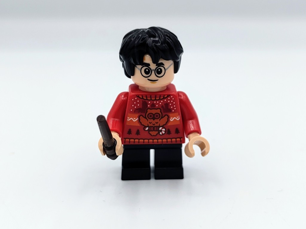 Wir starten den Harry Potter Adventskalender mit… Harry Potter! So weit so wenig überraschend. Harry trägt einen Strickpullover im rot des Hauses Gryffindor – darauf abgebildet ist eine Eule, die statt eines Briefes eine Zuckerstange ausliefert. / Johann