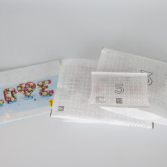 Die vier Buchstaben sind auf einem blassrosa Hintergrund platziert. Die Rückseite zeigt, wie man die vier Buchstaben zu dreien umbaut. Der Karton enthält erwartungsgemäß wenige Tüten und die Anleitung.