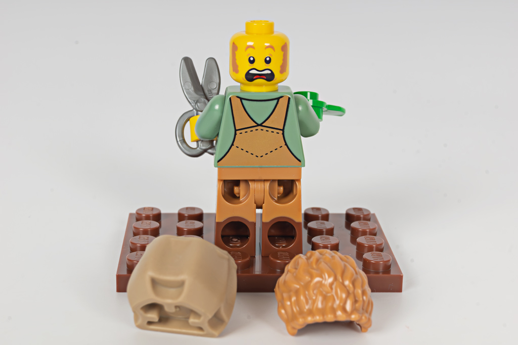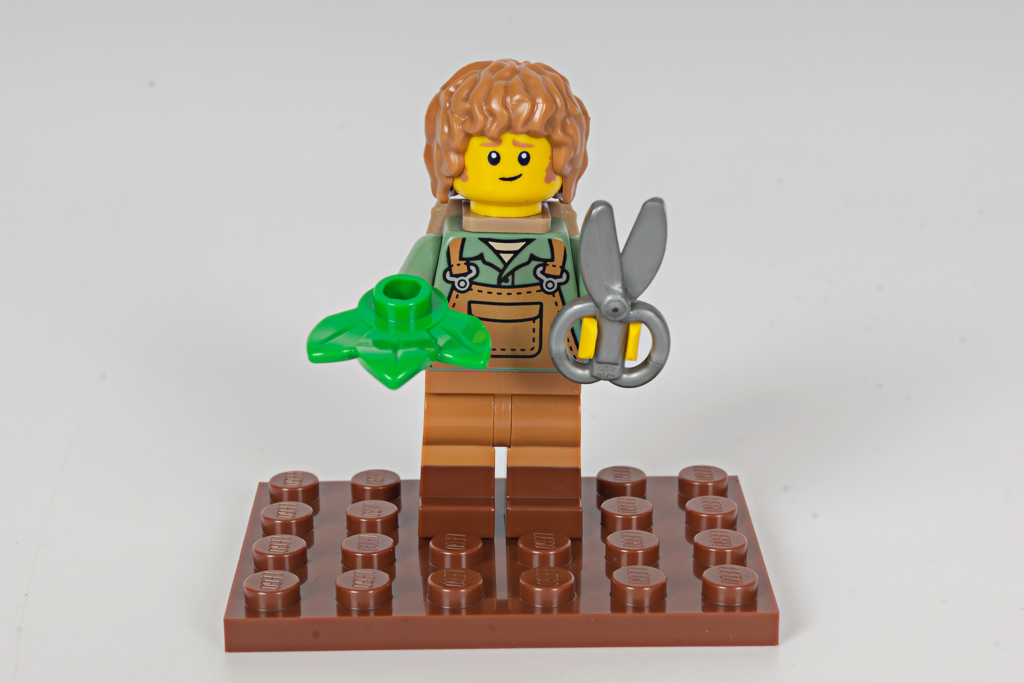 Als erstes bauen wir einen halbseitig fröhlichen, halbseitig verschreckten Gärtner. Da hat wohl jemand gerade eine Blattlaus entdeckt! Er verfügt über einen Torso mit Latzhose (973pb5887c01) und in Overmoulding-Technik hergestellte Hosen mit Gummistiefeln (970c00pb1023). Seine Haare (10048) sind für mich leider untrennbar mit den Hobbits verbunden, sodass ich hier immer nur einen überdimensionierten Bilbo sehe!