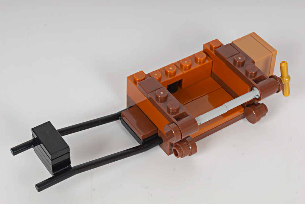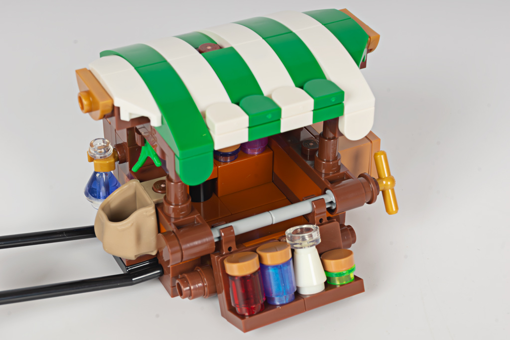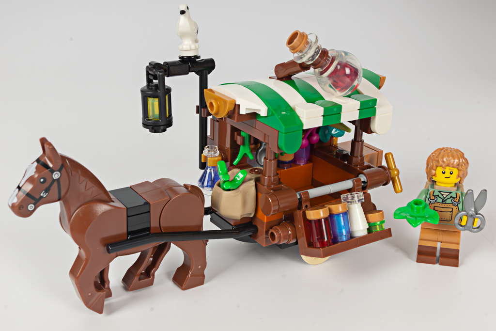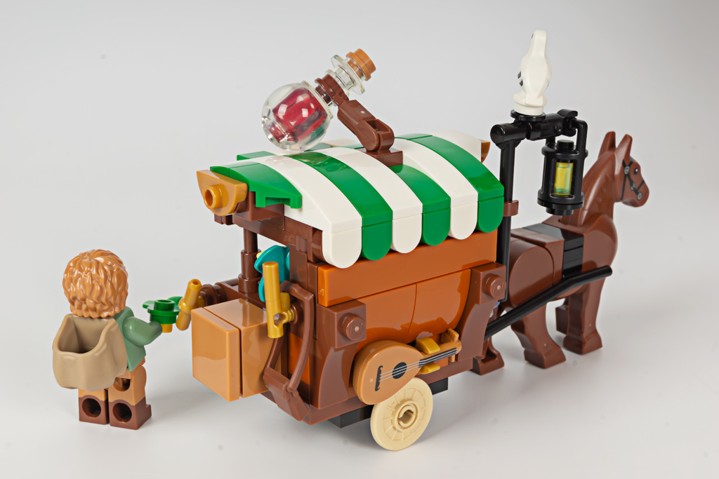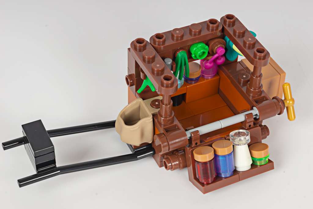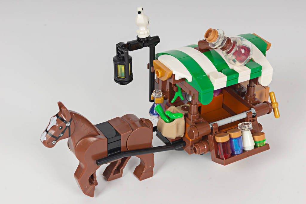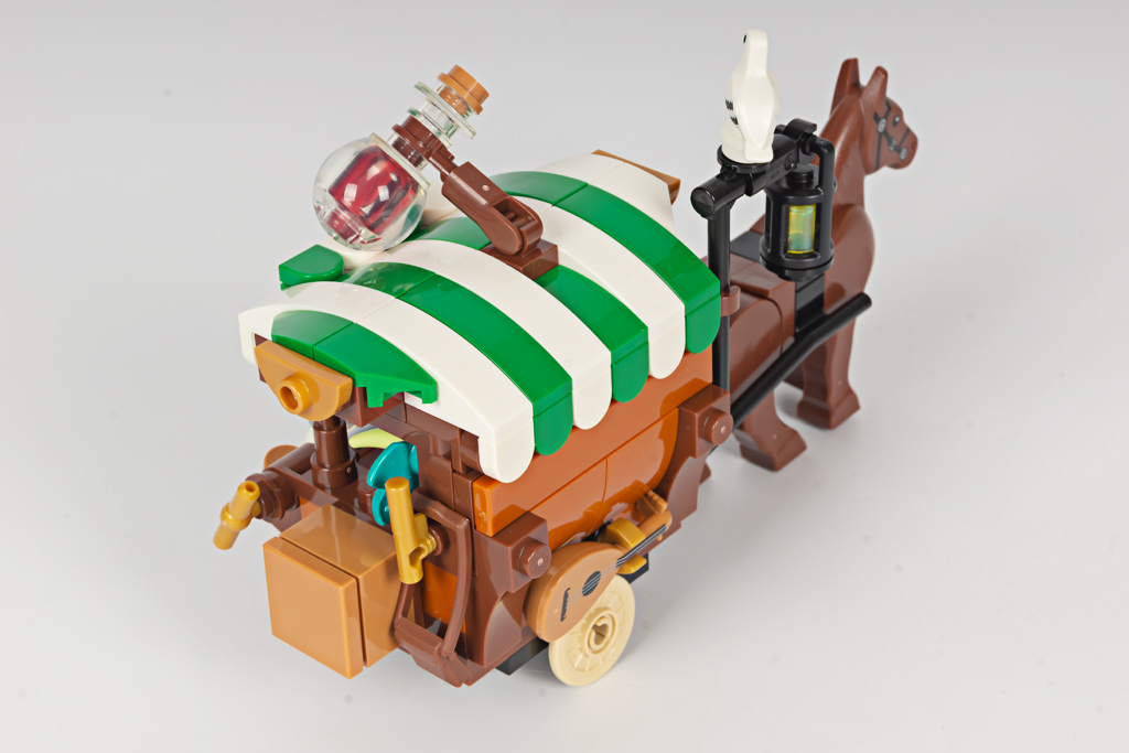 Der Wagen ist mit 4 x 6 Noppen sehr klein, aber erstaunlich detailliert eingerichtet. Verschiedene Pflanzen und Zaubertränke ziehen hervorragenden Nutzen aus dem Platz und der im BDP vorgeschriebenen Teilepalette. Durch Drehen an der Kurbel lässt sich das Vehikel blitzschnell in den Reisemodus bringen.