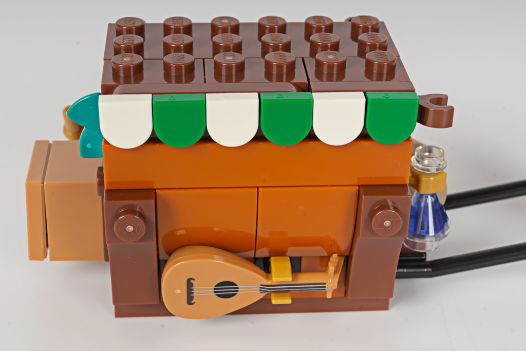 An der Rückseite ist sogar eine Laute (80503pb01) befestigt. An sich erfüllt sie keinen wirklichen Zweck, sondern ist einfach nur da, um das Set aufzuwerten. Diese erfreuliche Mentalität zieht sich durch das ganze Modell und lässt es deutlich wertiger wirken! Wichtig ist für mich, dass unter solchen Spielereien die Optik nicht leidet, und das ist definitiv der Fall hier! So gefällt mir die gestreifte Markise mit dem hochgekrempelten Rand vorn wirklich gut.