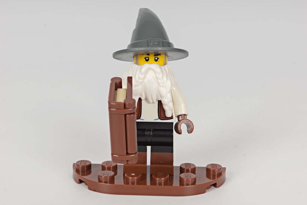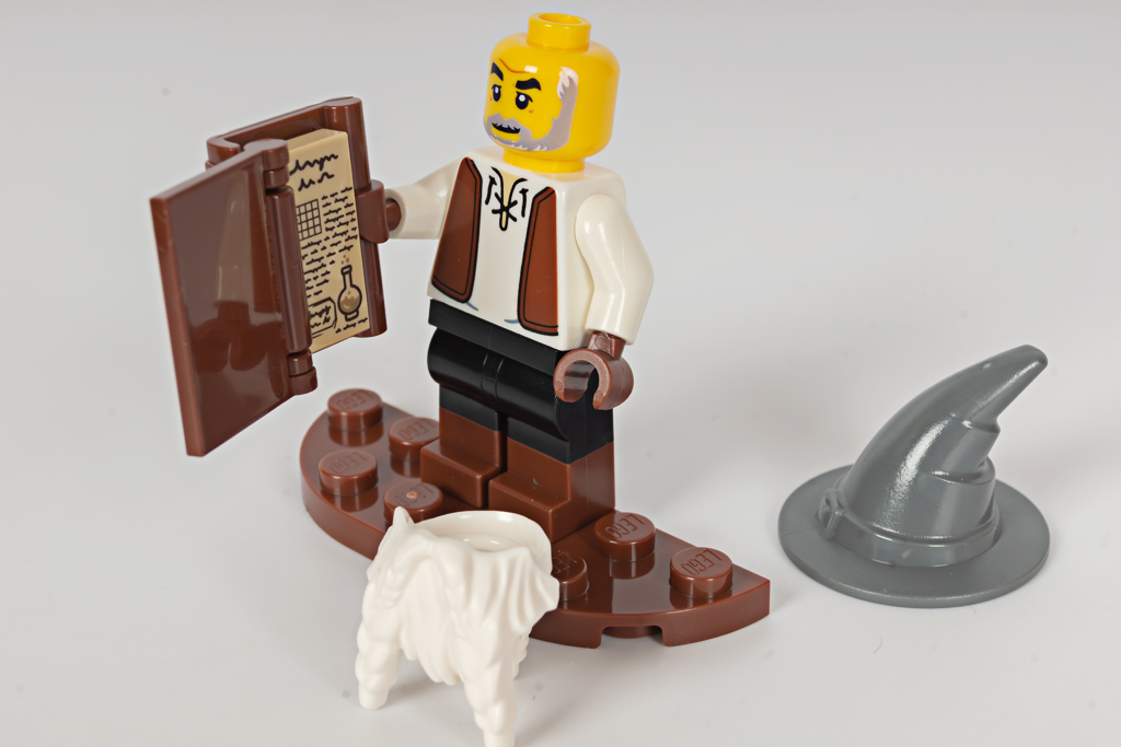 Der Alchemist ist ein in Ehren ergrauter Mann mit schlohweißem Rauschebart (2676), der nicht ganz zur Haarfarbe auf dem Kopf (3626pb2144) passt. Sein Spitzhut (6131) passt dagegen wieder gut zu einem Zauberer der Elixiere wie ihm. In der Hand hält er ein uraltes Buch mit mysteriösen Anleitungen. Dieses Element (3069pb1263) ist übrigens bedruckt und entstammt LEGO Wicked.