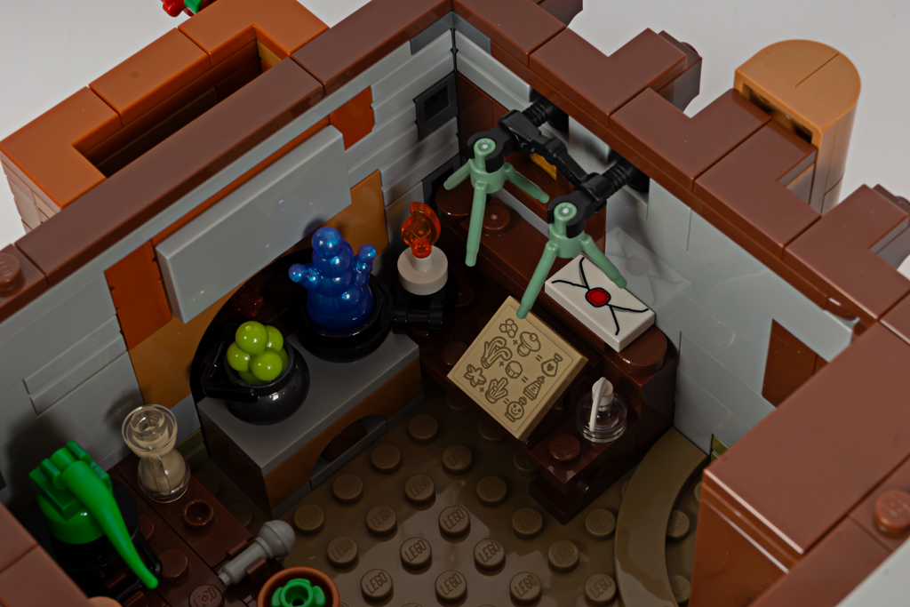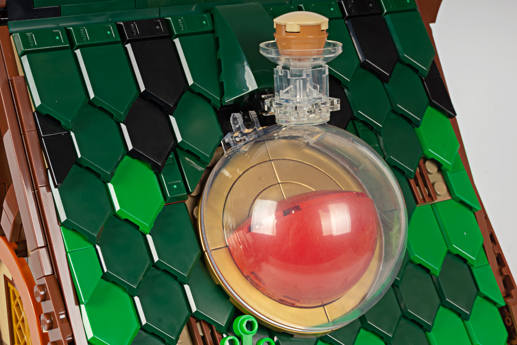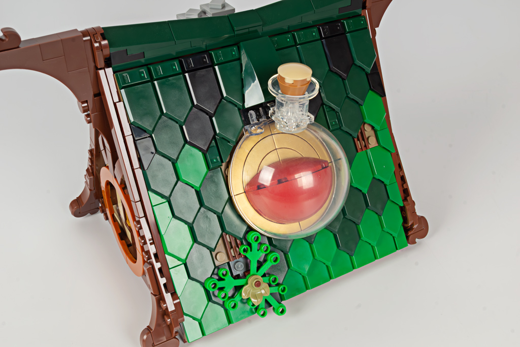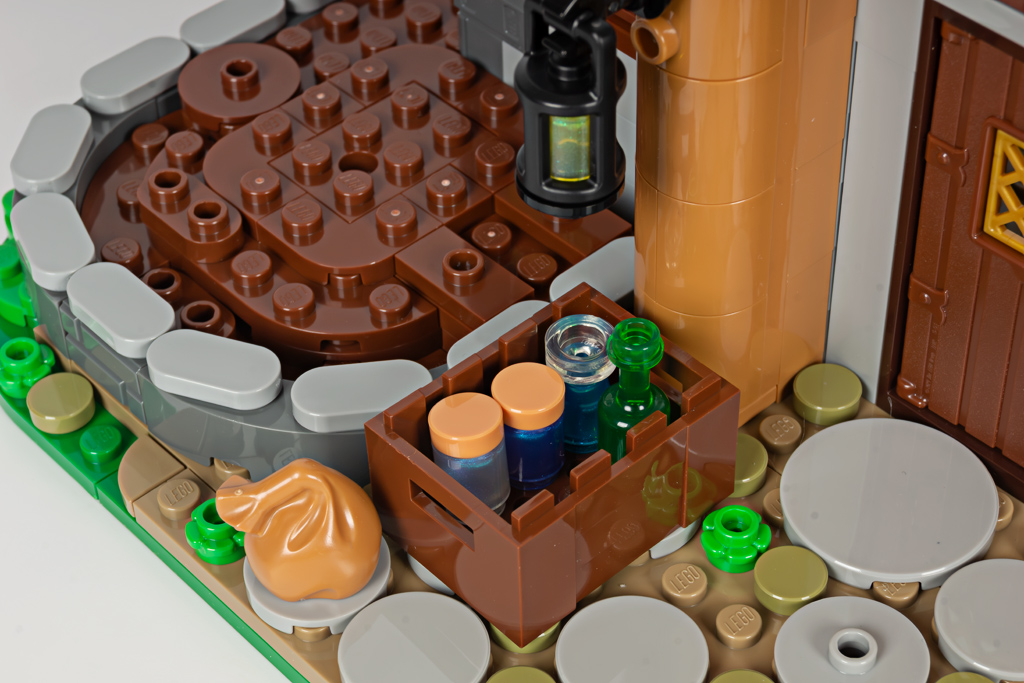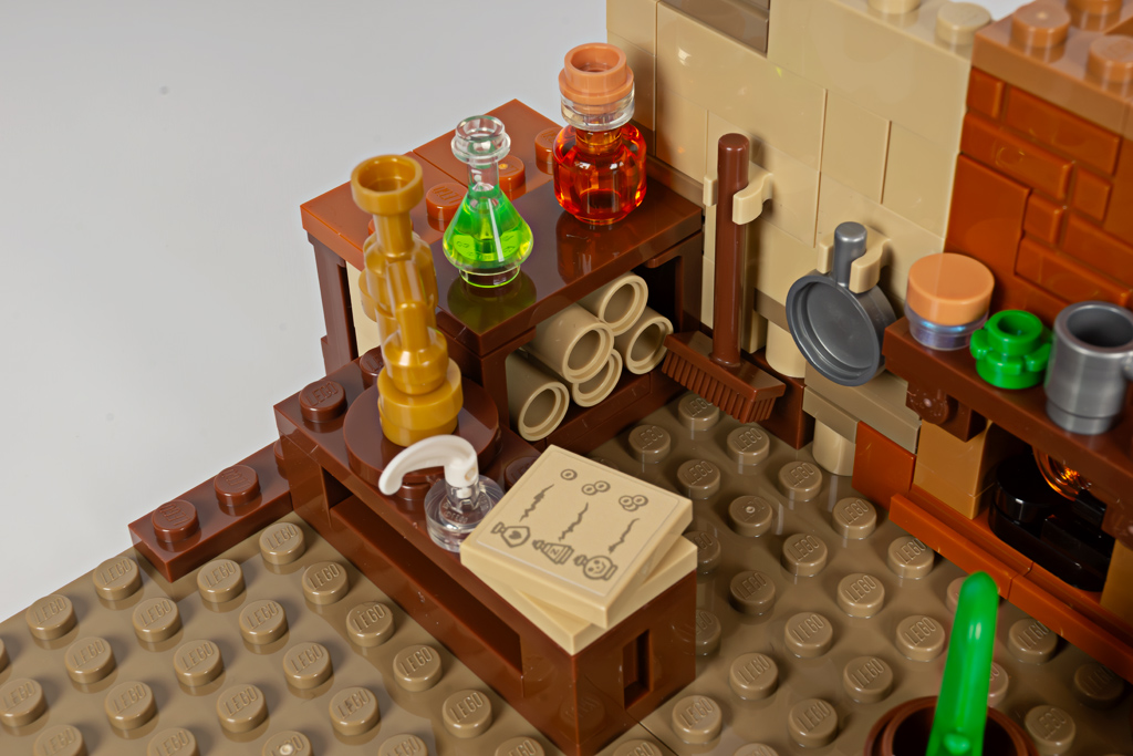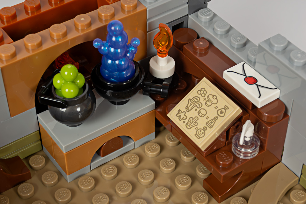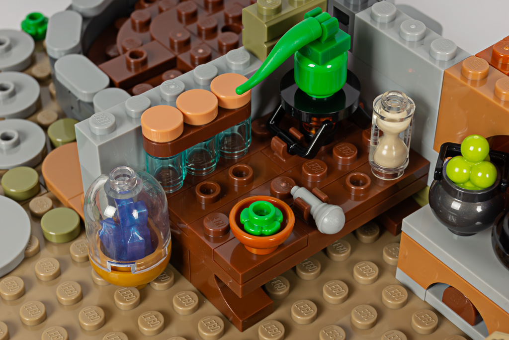 Insgesamt werden hier einige „seltene“ Teile genutzt, so etwa die Blubberblasen (5533) in Satin Trans-Purple oder die Sanduhr (23945pb02), die dem Alchemisten anzeigt, wie lange die Tränke noch köcheln müssen.