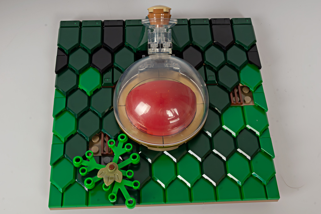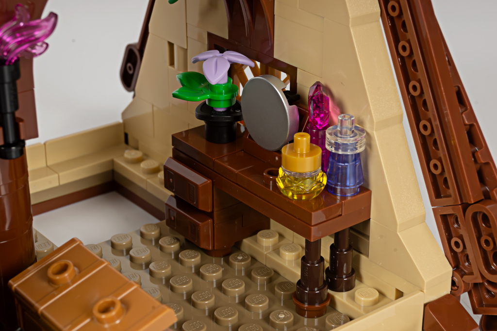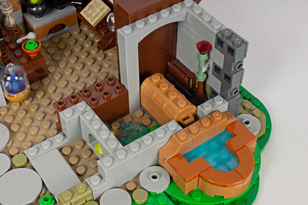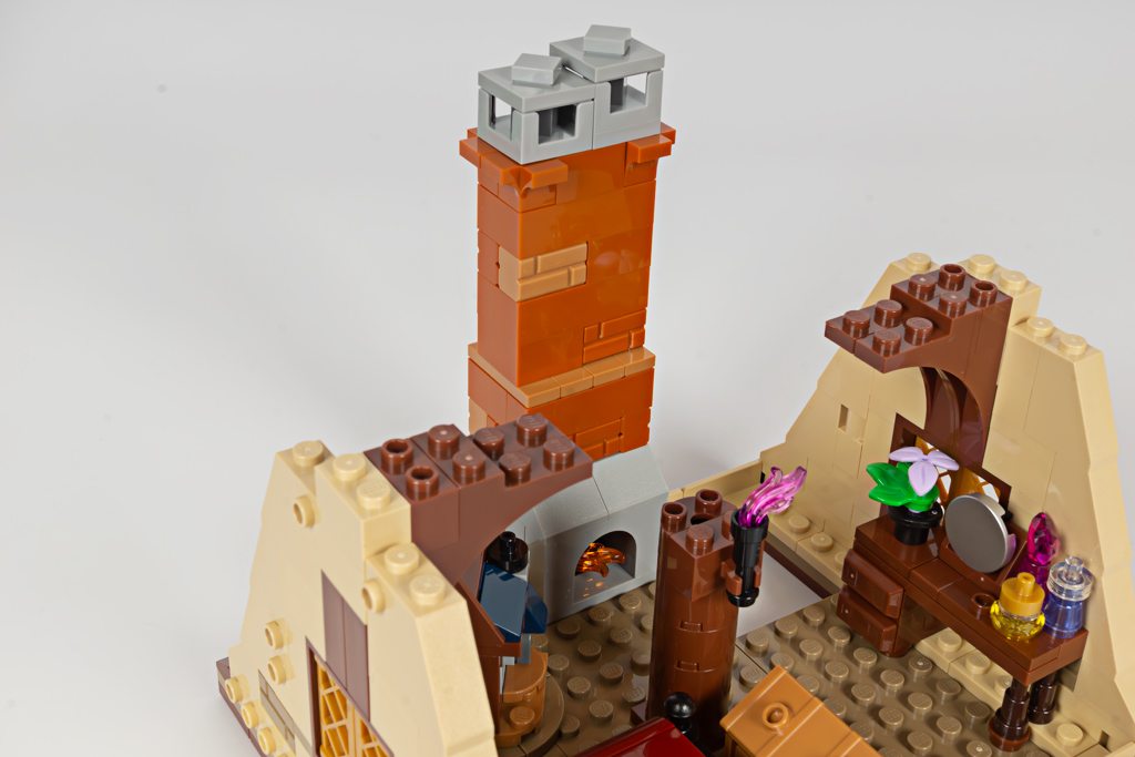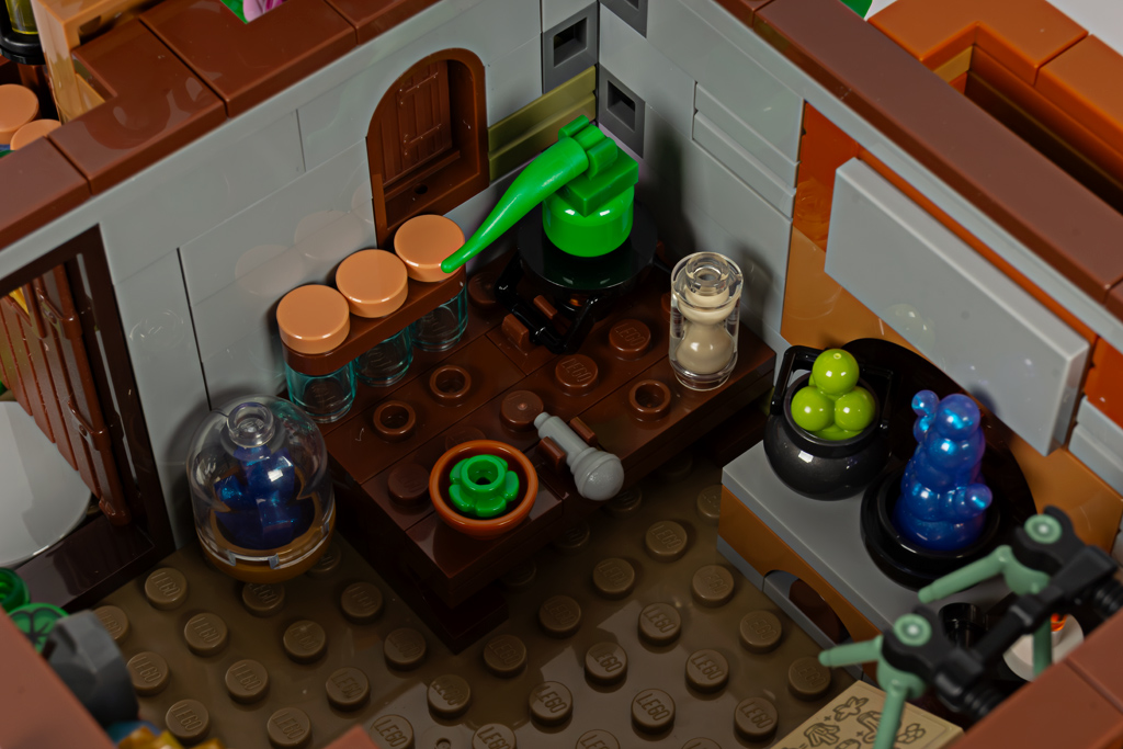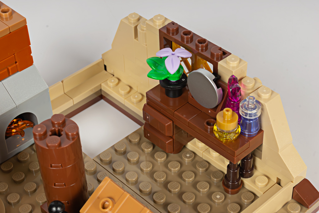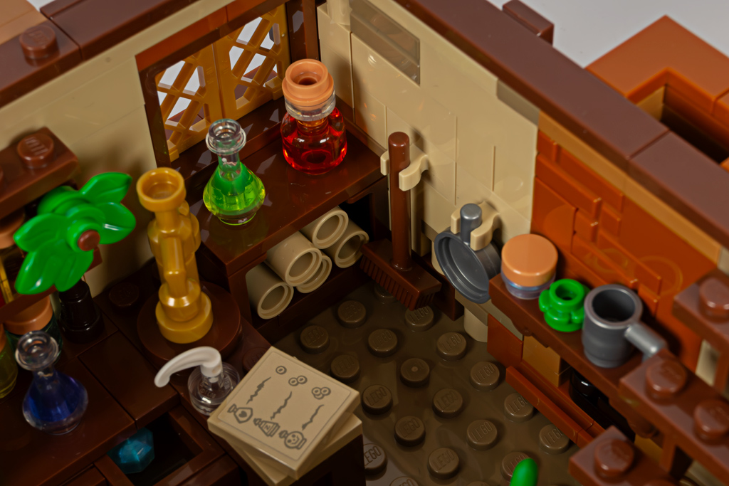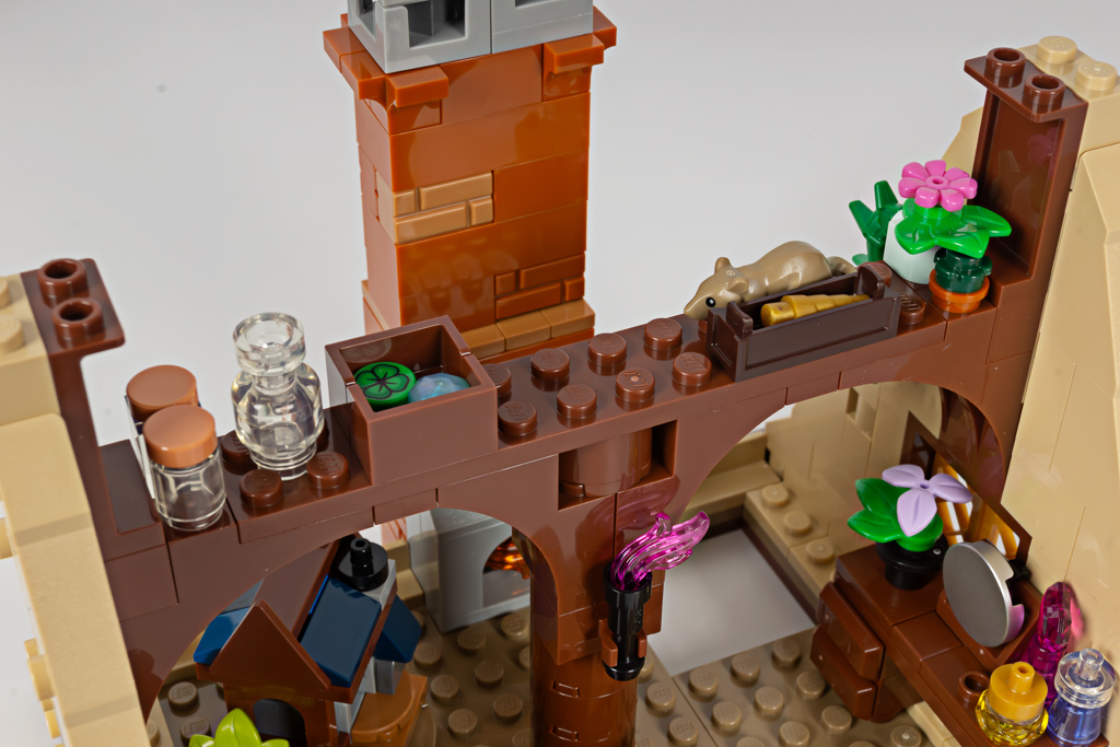 Insgesamt werden hier einige „seltene“ Teile genutzt, so etwa die Blubberblasen (5533) in Satin Trans-Purple oder die Sanduhr (23945pb02), die dem Alchemisten anzeigt, wie lange die Tränke noch köcheln müssen.