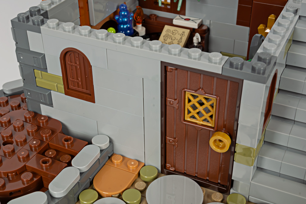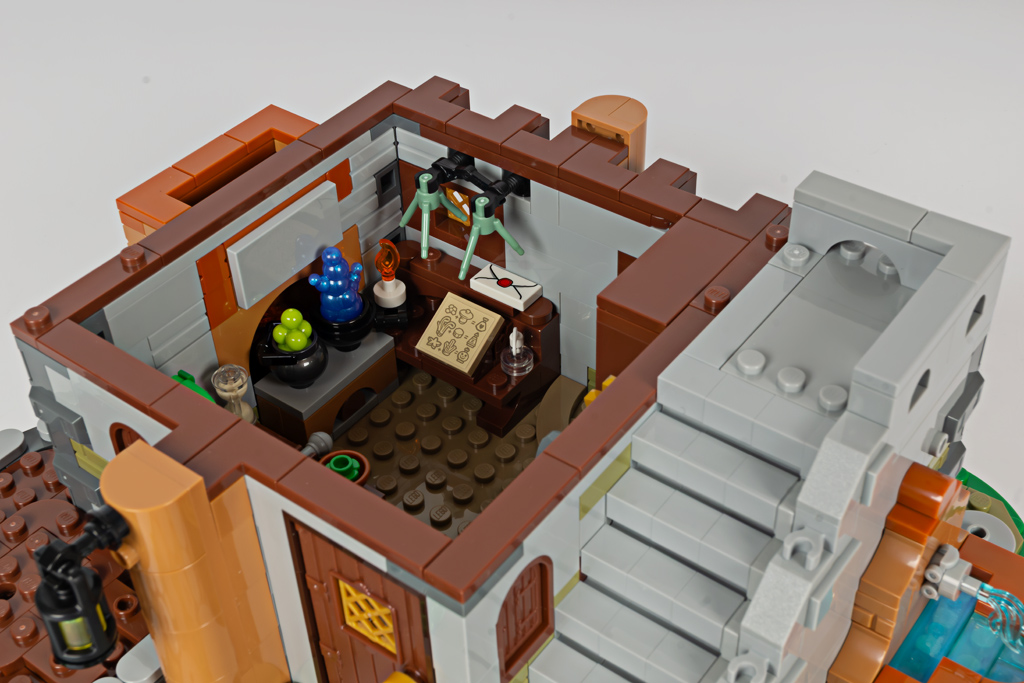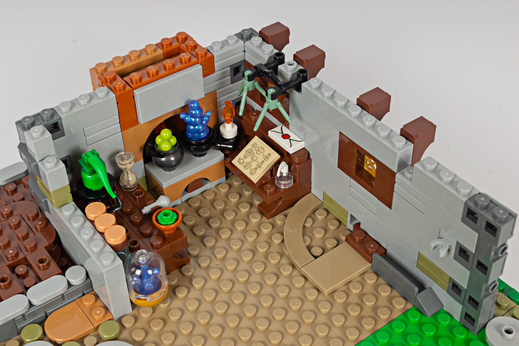 Die Werkstatt des Alchemisten ist in Grautönen gemauert und verfügt über einen großen Kamin. Ich hätte mir gewünscht, wenn der Boden gefliest gewesen wäre, dies hätte aber wieder Teile verbraucht und war auch bei der 21325 Mittelalterlichen Schmiede, dem Vorbild des Ladens hier, nicht der Fall.