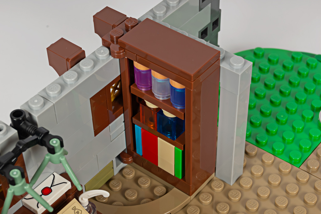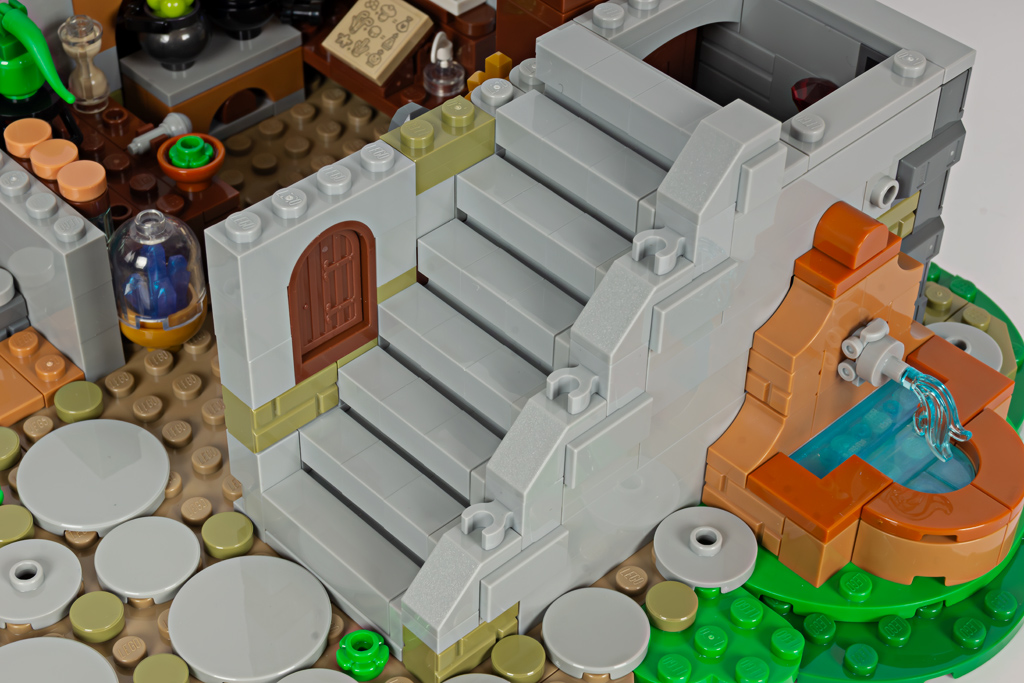 Zurück im Labor bauen wir noch ein Regal mit weiteren Artefakten und Ingredienzen, darunter etwa eine mystische Geode (49656pb09) aus (wortwörtlich) grauer Vorzeit. Danach wird der Geheimraum durch die Treppe verborgen, sodass niemand jemals und niemals jemand darauf stoßen wird! Die Treppenstufe nutzen übrigens spezielle modifizierte Steine mit Fuge (4216), die üblicherweise für Garagentore genutzt werden und hier für eine Abstufung der Stufen sorgen!