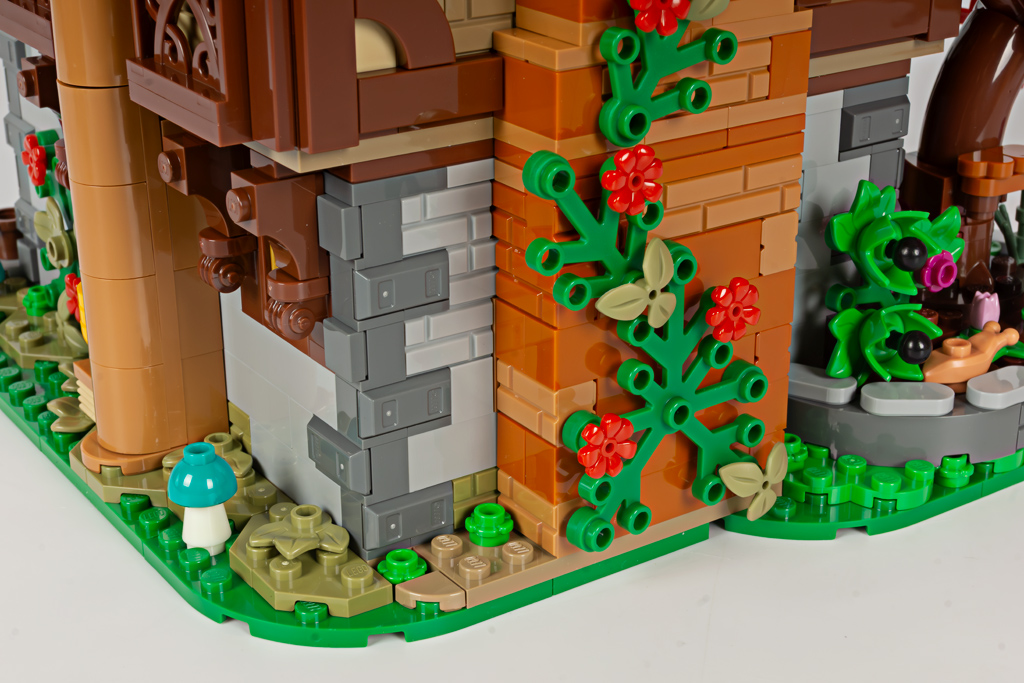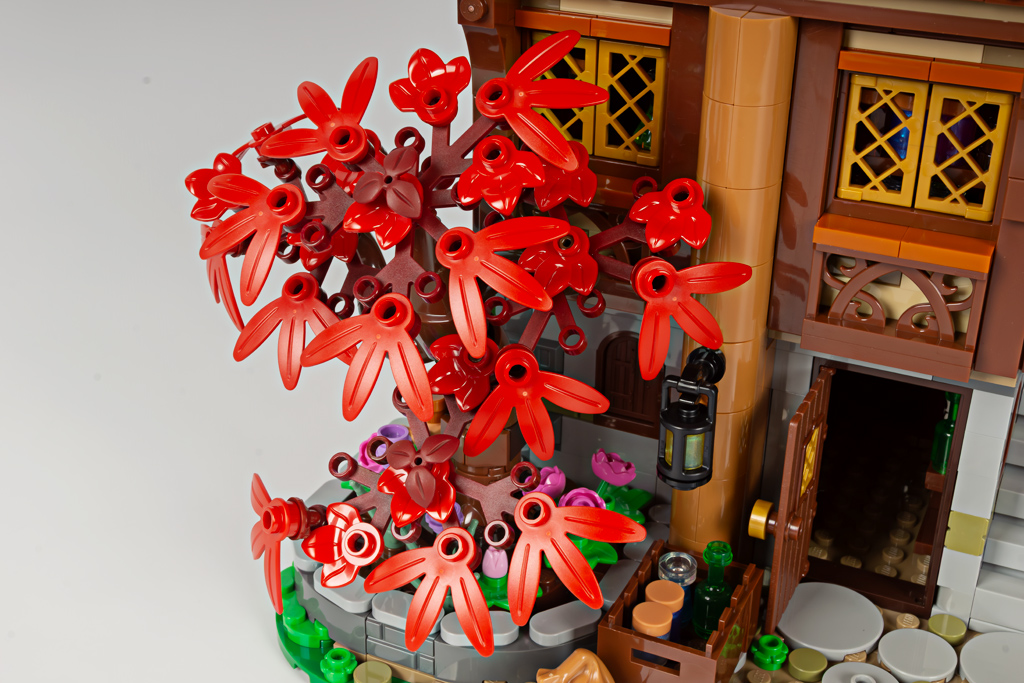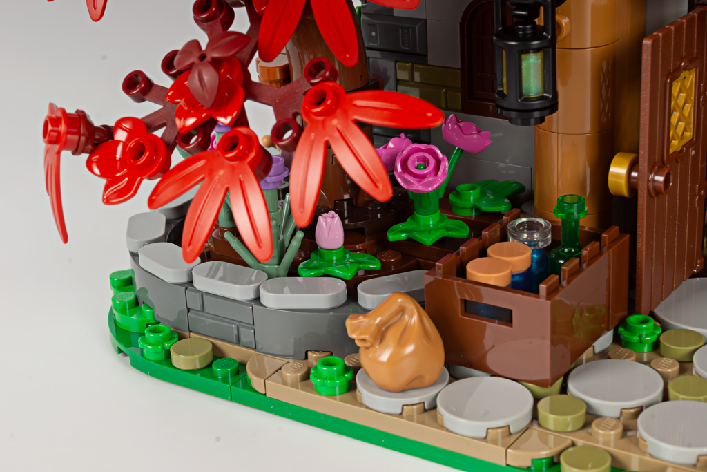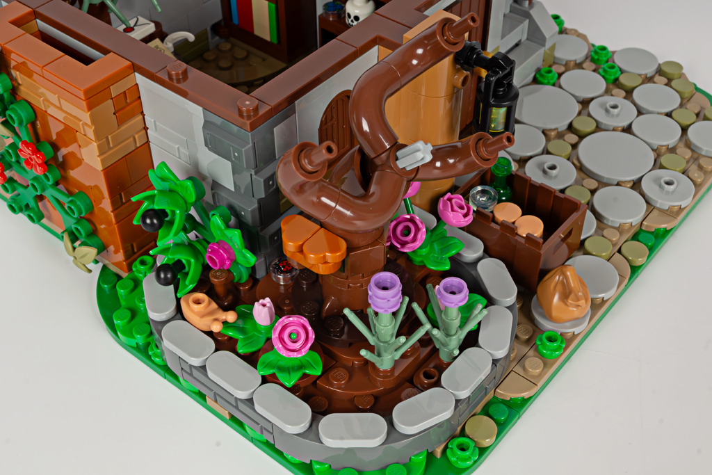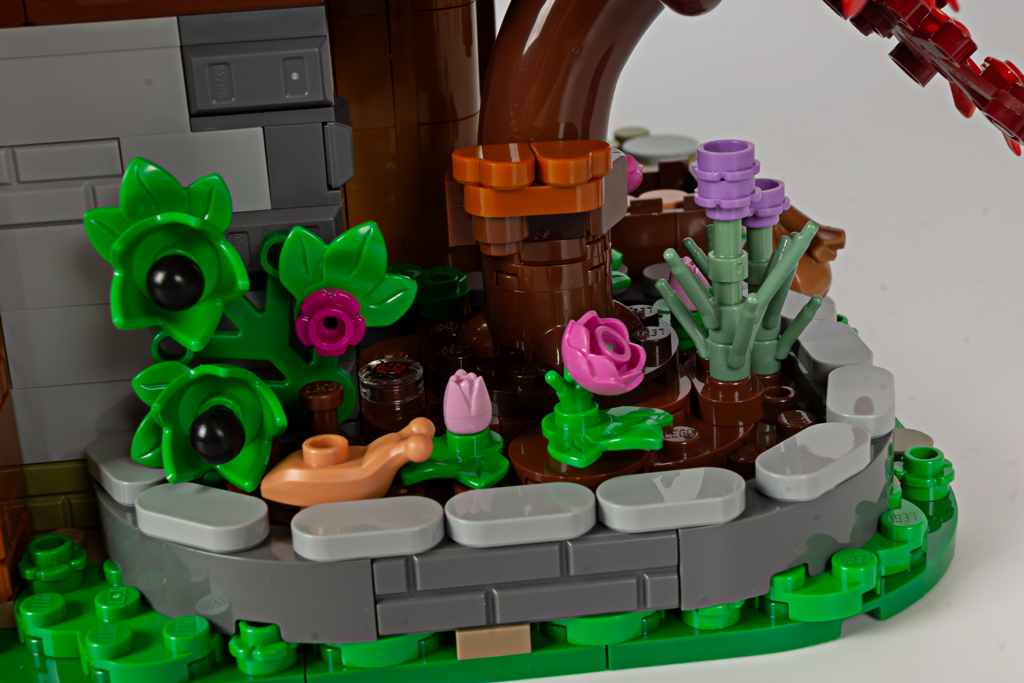 Als letztes wird der Baum eingebaut, der naturgemäß etwas repetitiv und fummelig zusammenzusetzen ist, aber dank der neuen Blattelemente (7264) fantastisch wirkt! Und inmitten der ganzen Blumen im Beet sehen wir auch den Grund für des Gärtners Schrecken: eine riesige Schnecke (7443)! Doch keine Blattlaus…