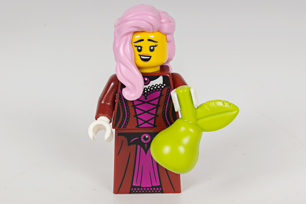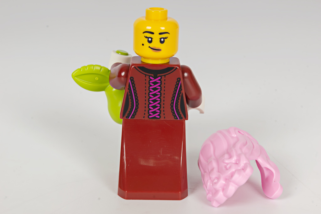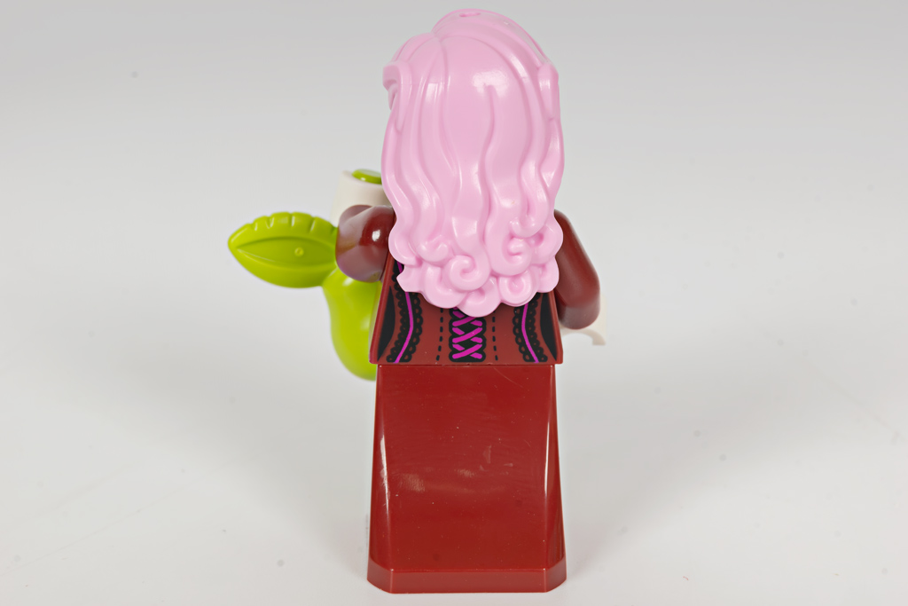 Die Verkäuferin im Laden ist dazu bestimmt, später, nach ihrem Leben, zum Vampir zu werden! Zumindest entstammen ihr wunderschöner Torso (973pb6234c01) und Rock (36036pb091) der Vampirin (twn530) aus dem 31167 Geisterhaus. Ihre nicht minder schönen Haare (6986) sind neu in Bright Pink und bei LEGO Friends in der 42685 Modeschau in Heartlake City erschienen. Sie trägt eine der neuen Birnen (5822) von 2025, und wenn man nun bedenkt, dass ihr Job das Andrehen von Elixieren und Wundermitteln ist, könnte man glatt meinen, dass sie die Birne zum Verführen der Kunden braucht, wie bei Schlange, Eva und Apfel!