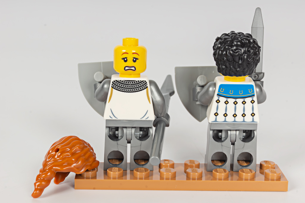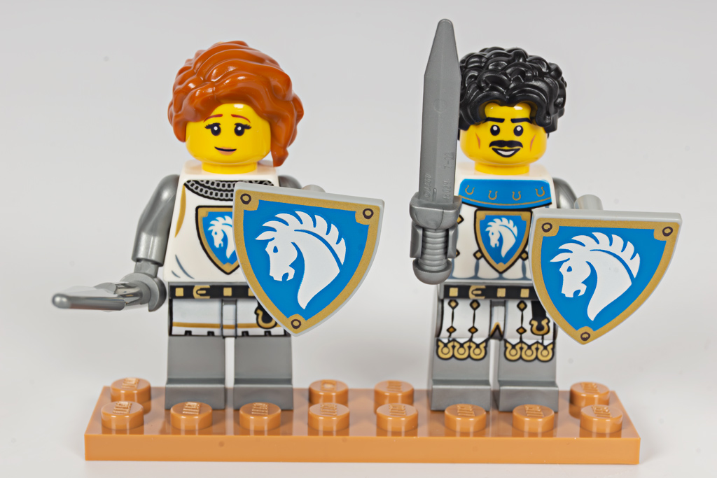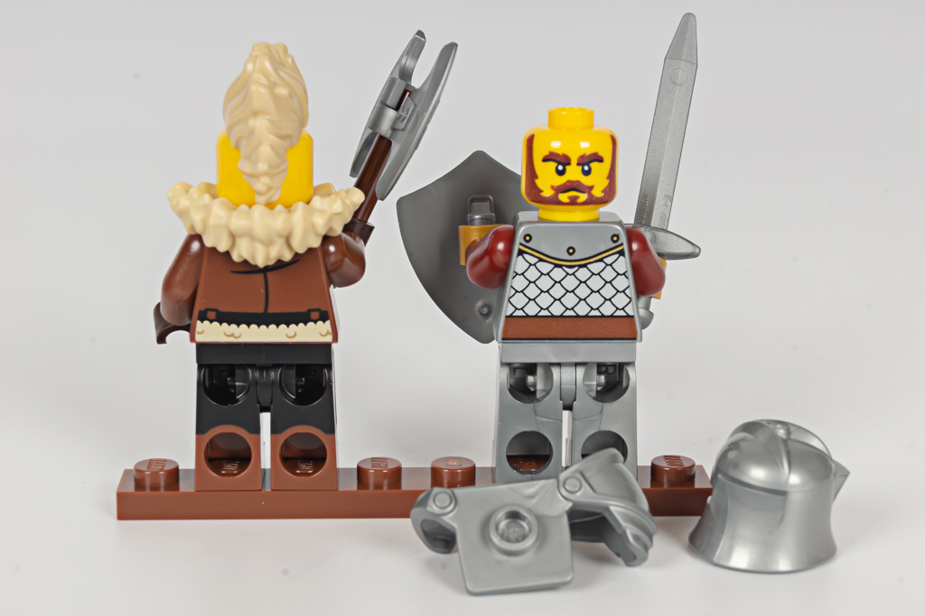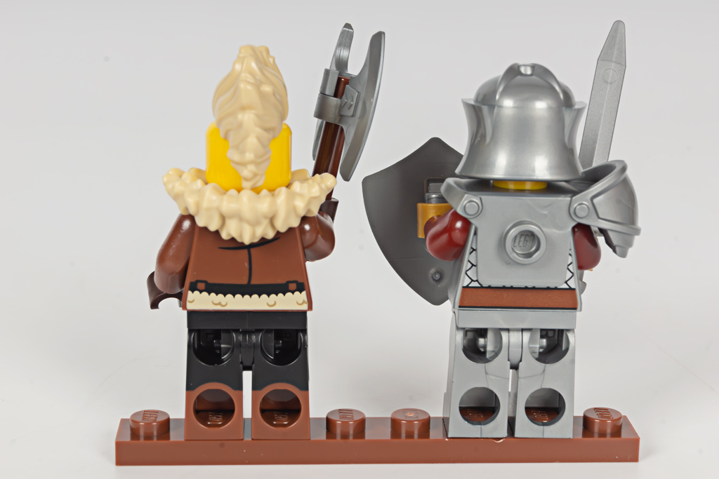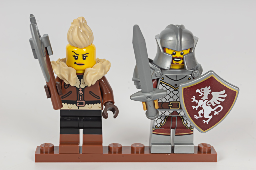 Zwei der besten Kunden der Dame haben wir hier: eine Barbarin und einen Greifenritter. Für sie dürfte es ein Liebestrank sein, denn wer verguckt sich schon in so eine Punkerfrisur (3758)?! Er dagegen sucht wohl nach dem ultimativen Kampfeselixier, damit er seine massive Bewaffnung endlich einmal nach Gebühr einsetzen kann, und nicht immer nur, um die Burgfrollein zu beeindrucken! Auch den Greifenritter mit seinem neuen Torso (973pb6134c01), den Hosen (970c00pb1762) und dem Schild (4972pb02) verdanken wir dem 21358 Spielzeugautomaten mit Minifiguren. Eine Minifigur auf CMF-Niveau!