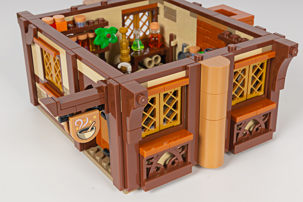 Der Aufbau gliedert sich erwartungsgemäß in den kleinen Alchemisten-Wagen und den Laden. Letzterer wird geradlinig, Etage für Etage, von unten nach oben gebaut. Das Set verfügt über einen kleinen Stickerbogen, der aber vollkommen verzichtbar ist. Exklusiv bedruckte Teile gibt es beim BDP nicht, sodass spezielle Motive eben nur via Aufkleber umgesetzt werden können. Von den fünf Stickern sind sogar nur zwei von außen sichtbar, und auch diese sind nur klein.