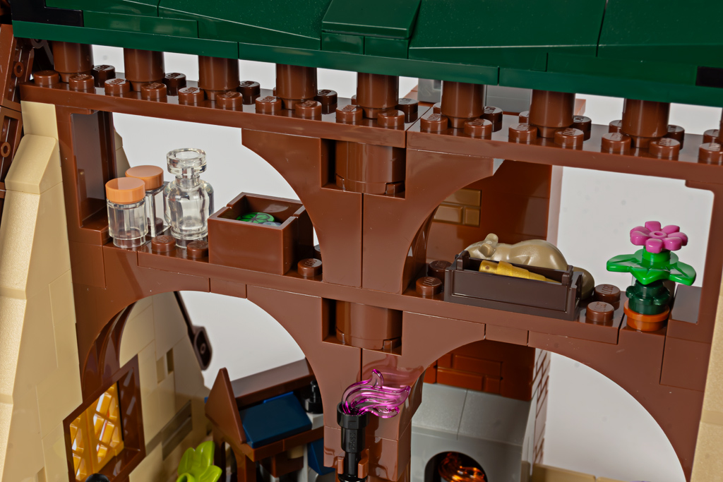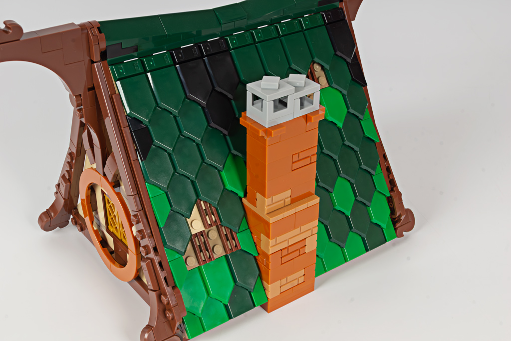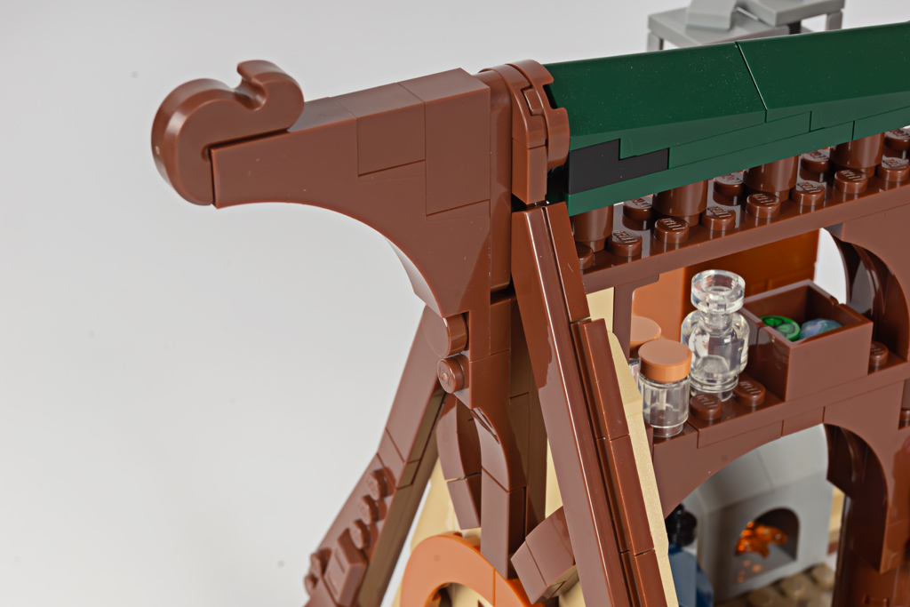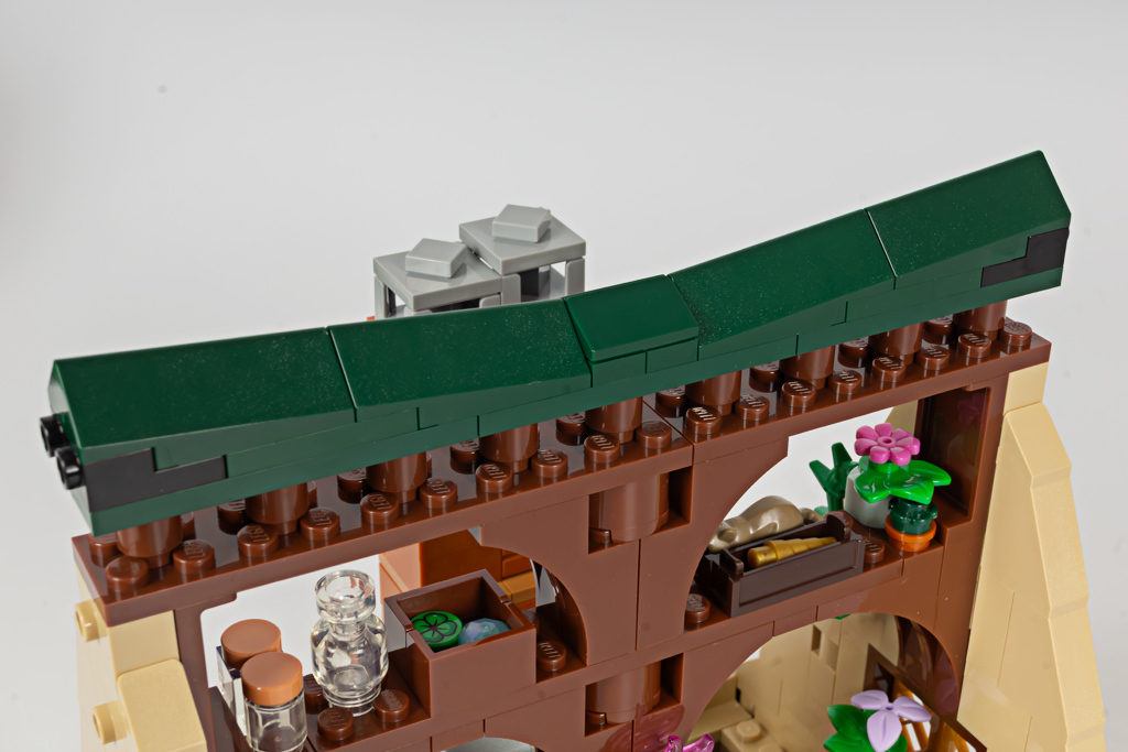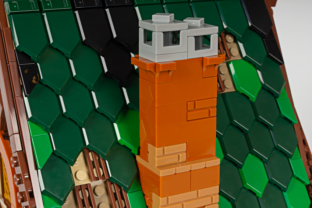 Ein Konstrukt aus Holzbalken stützt das Dach und wurde vom Designer genutzt, um noch ein paar Gegenstände unterzubringen. Abermals an sich unnötig, ich mag das aber, zumal ich selbst in meinen eigenen MOCs Angst vor Leerraum habe… Den Dachfirst bilden hier dunkelgrüne Schrägsteine (80545), die in der Mitte flacher zulaufen. Daneben endet der Schornstein mit zwei Auslässen.
