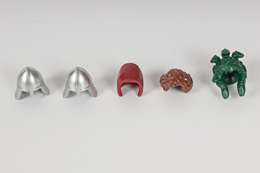 Fünf Helme und Haarteile liegen zusätzlich bei. Die beiden Pferderitter bekommen Helme (3844), die Verkäuferin kommt unter die Haube (74528), der Greifenritter erhält eine Perücke (11256) und die Krakenritter-Banditin ein sehr passendes Schlangen-Haarteil (5517) aus Monkie Kid.