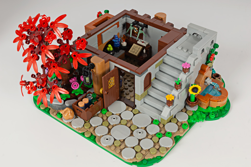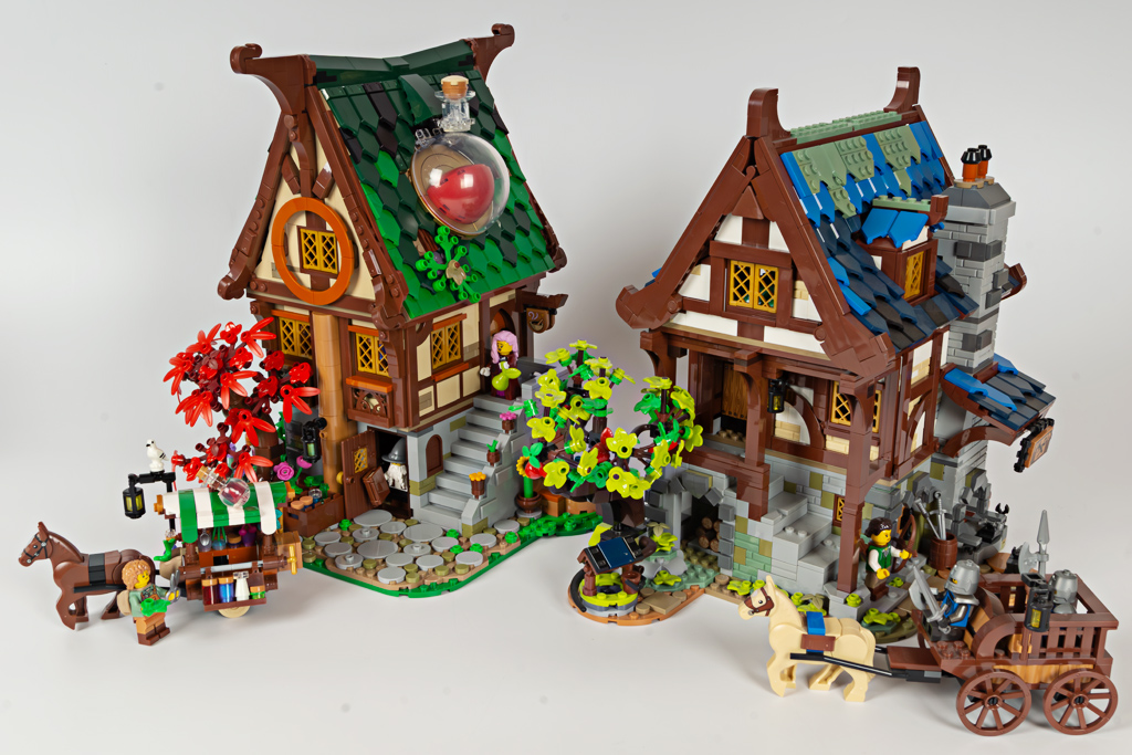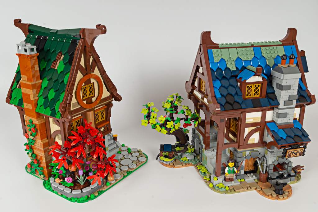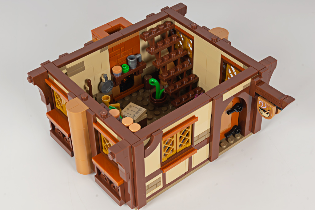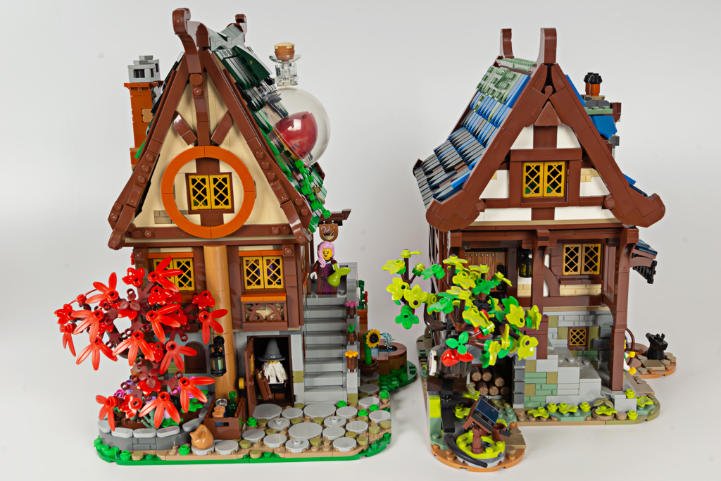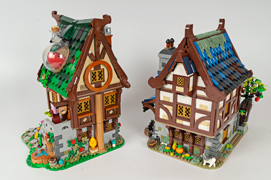 Wie schon mehrfach angeschnitten, hat sich der Fandesigner beim 910062 Laden des Alchemisten von der 21325 Mittelalterlichen Schmiede inspirieren lassen, die 2021 bei LEGO Ideas erschien. Und so überrascht es auch überhaupt nicht, dass beide Modelle eine ähnliche Größe haben, Fachwerkhäuser sind und sogar über die gleiche Bauweise für das Dach verfügen! Beiden Sets liegt ein separater Wagen bei, vor den Häuschen steht jeweils ein Baum, sie haben drei Etagen, wobei eine Steintreppe ins Obergeschoss führt, und ein Schornstein führt an der Außenmauer empor.
