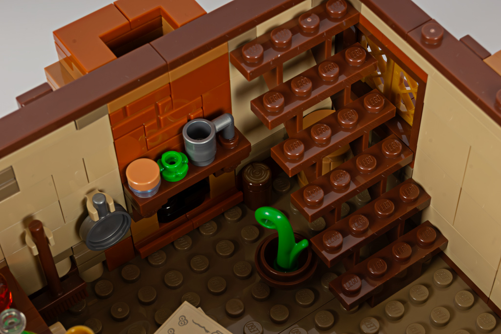 Aber auch das Häuschen ist rundum wunderschön ausgestaltet, mit Vorsprüngen, leichtem Verfall und diversen Pflänzchen. Absolut fantastisch! Vor allem aber ist das Modell durchweg stabil und nutzt keinerlei fragwürdige Bautechniken, die dem Ruf von BDP-Sets nur allzu oft anhängen… (Und das zu Recht, wie ich beim 910044 Zug im Wilden Westen leidvoll habe feststellen müssen…)
