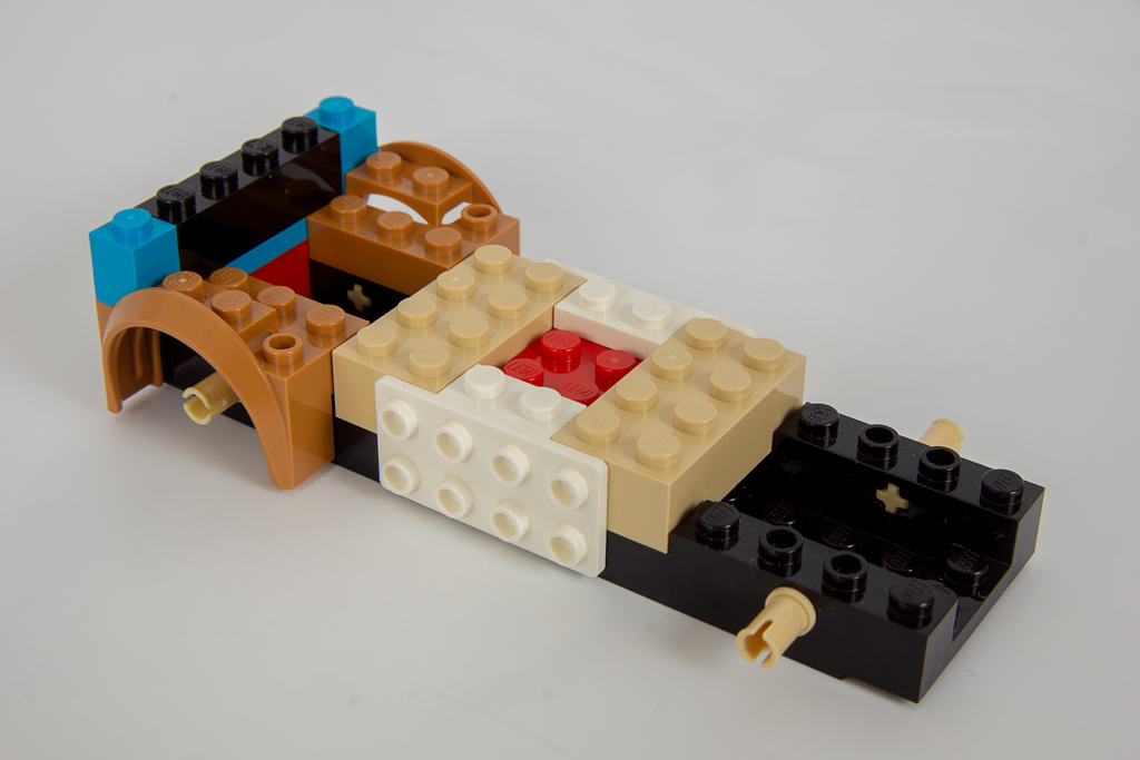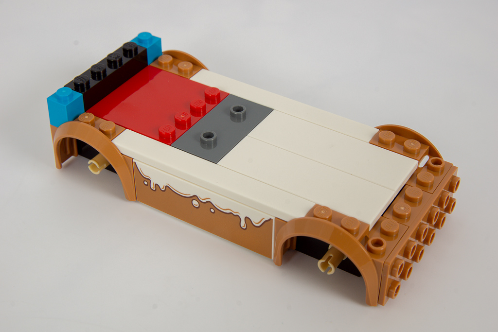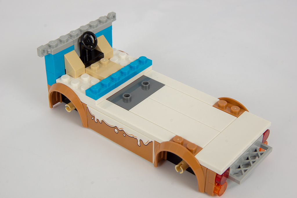 Der Aufbau des Donut-Trucks beginnt mit dem Chassis-Formteil (7035), auf das nach und nach einige Steine und Platten gesetzt werden, um eine gerade Fläche zu erzeugen. Die Radkästen (3387) sind in Medium Nougat neu erschienen, und symbolisieren den Teig des Donuts.