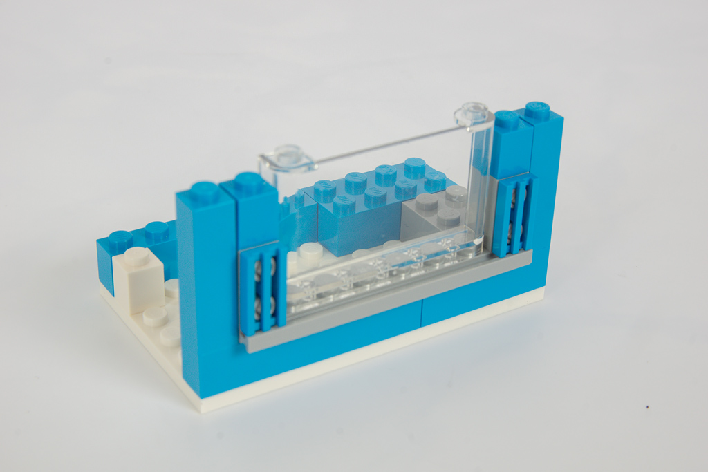 Spätestens, wenn der Stand ein Dach bekommen hat, fällt auf, wie flach er ist. Kaum, dass eine Minifigur darin stehen kann. Die Größe (oder Kleine?) ist aber notwendig, damit der Stand auf dem Truck nicht überdimensioniert wirkt. Somit wäre es vielleicht besser gewesen, ihn nicht abnehmbar zu gestalten, auf Kosten der damit verbundenen Spielfunktion.