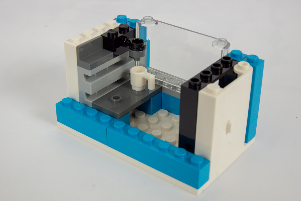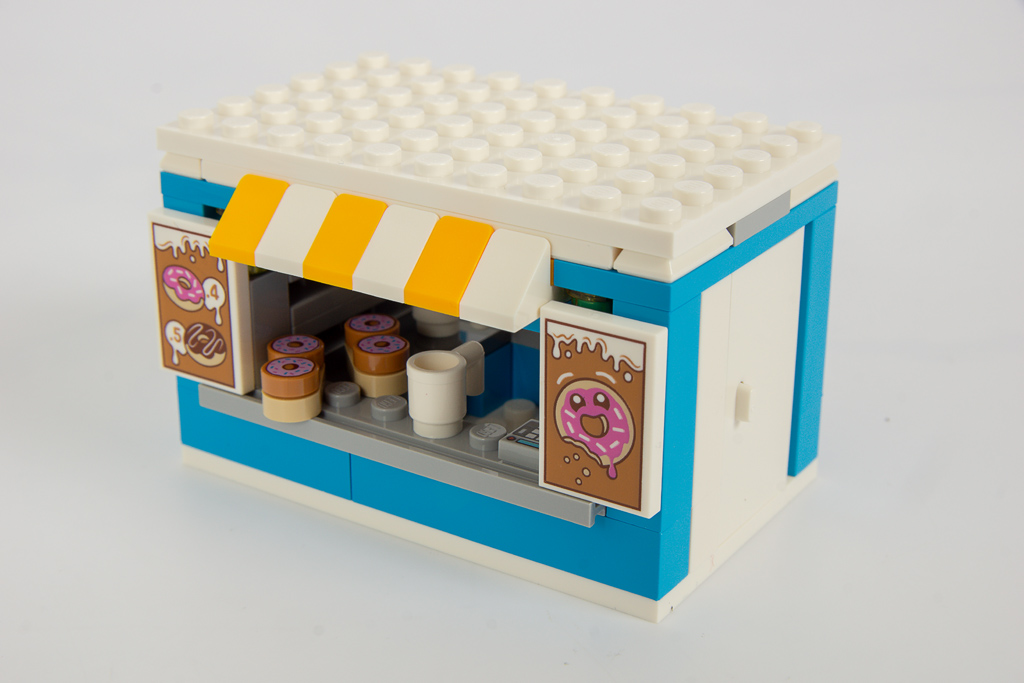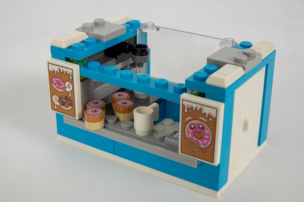 Der Donut-Stand ist separat gebaut, um abnehmbar zu sein. Sein Inneres ist leider sehr spartanisch eingerichtet, mit nur einer Kaffeemaschine. Es gibt nicht einmal ein Fach für die Donuts, geschweige denn eine Fritteuse! Das lässt nur einen Schluss zu: Der Donut-Verkäufer betreibt den Stand nur zur Tarnung, um die gegenüberliegende Bank auszuspionieren, und die Polizistin weiß das! Der 100-Taler-Schein ist also Schweigegeld, von ihm an sie! (Bei der Unzahl Krimineller in LEGO City wäre das nicht überraschend…)