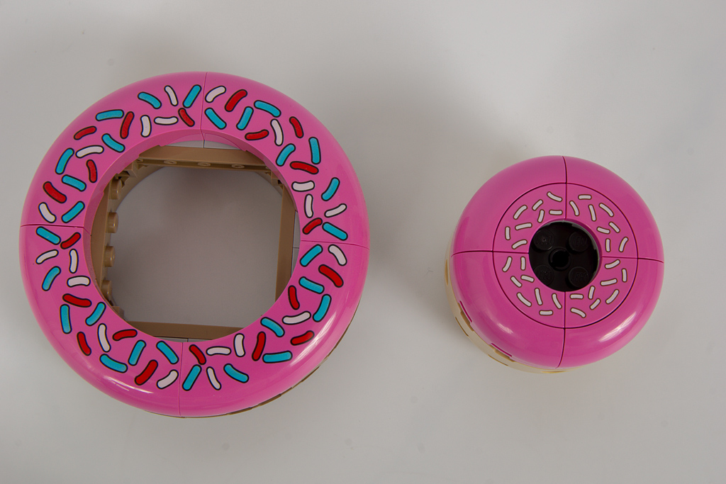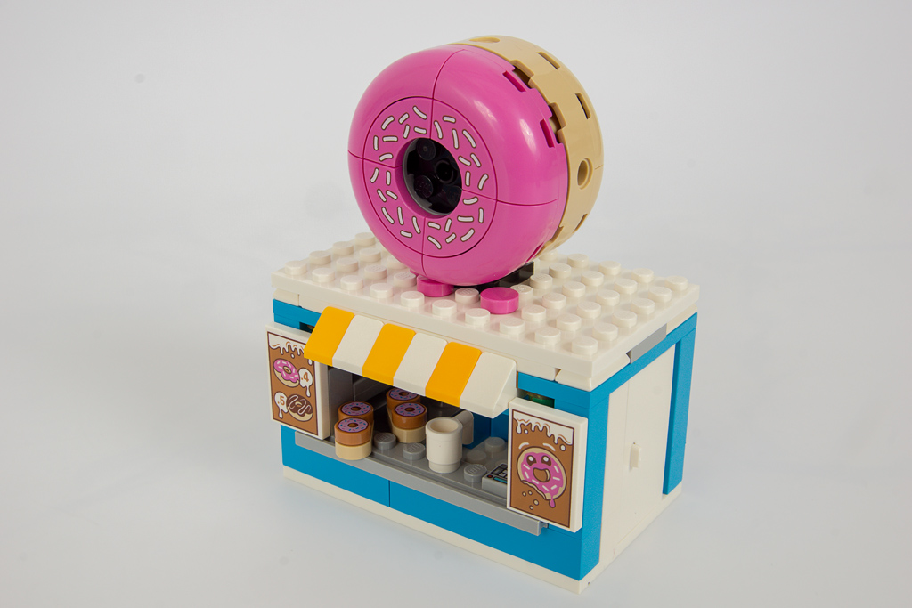Die Größe wird aber ausgeglichen durch den Monster-Donut auf dem Dach. Mit 3 x 3-Rundsteinen (65617) in Tan und Dark Pink wurde er schön abgerundet modelliert, und vier Macaroni-Kacheln (27925pb021) sind mit Zuckerstreuseln bedruckt. Der Donut ist frei drehbar gelagert, sodass er in alle Richtungen werben kann.