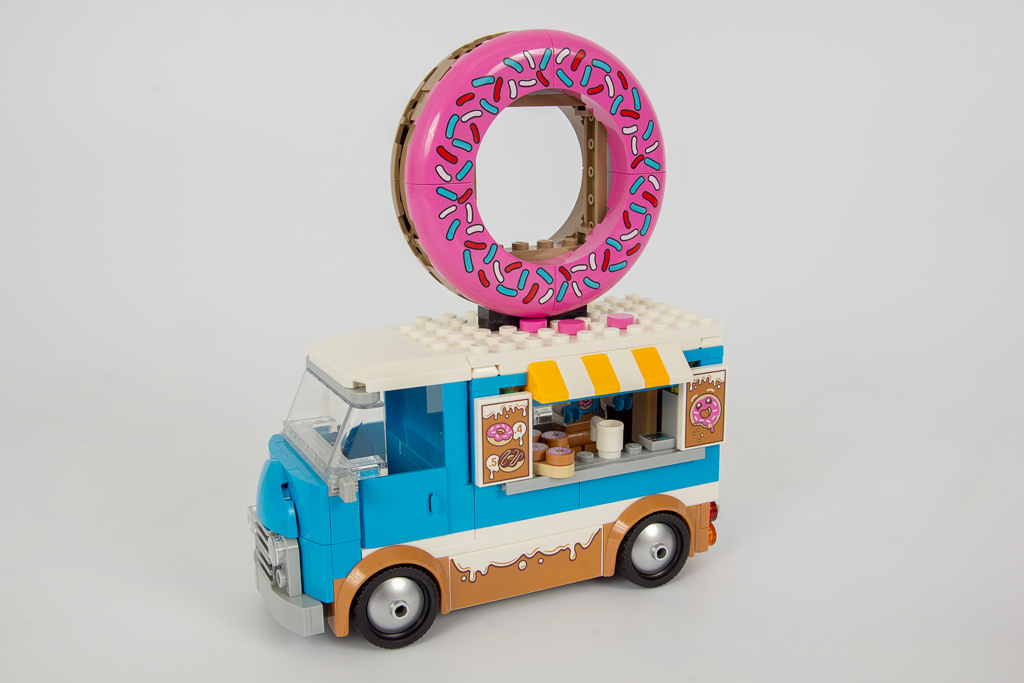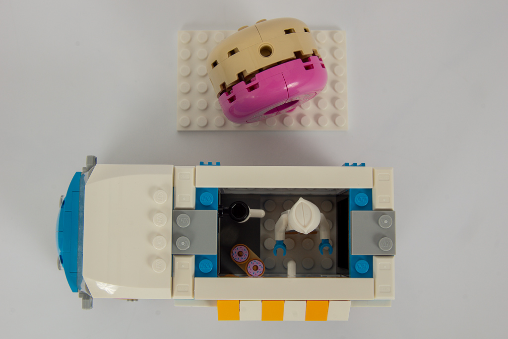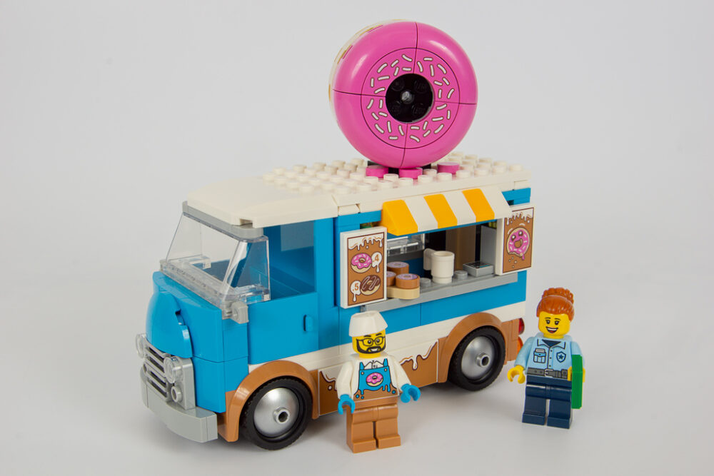 Apropos Donut: Ich habe da doch noch einen bei mir herumstehen! Die 2019 erschienene 60233 Große Donut-Shop-Eröffnung verfügt ebenfalls über ein derartiges Modell. Probieren wir mal, wie der Donut-Truck damit wirkt…