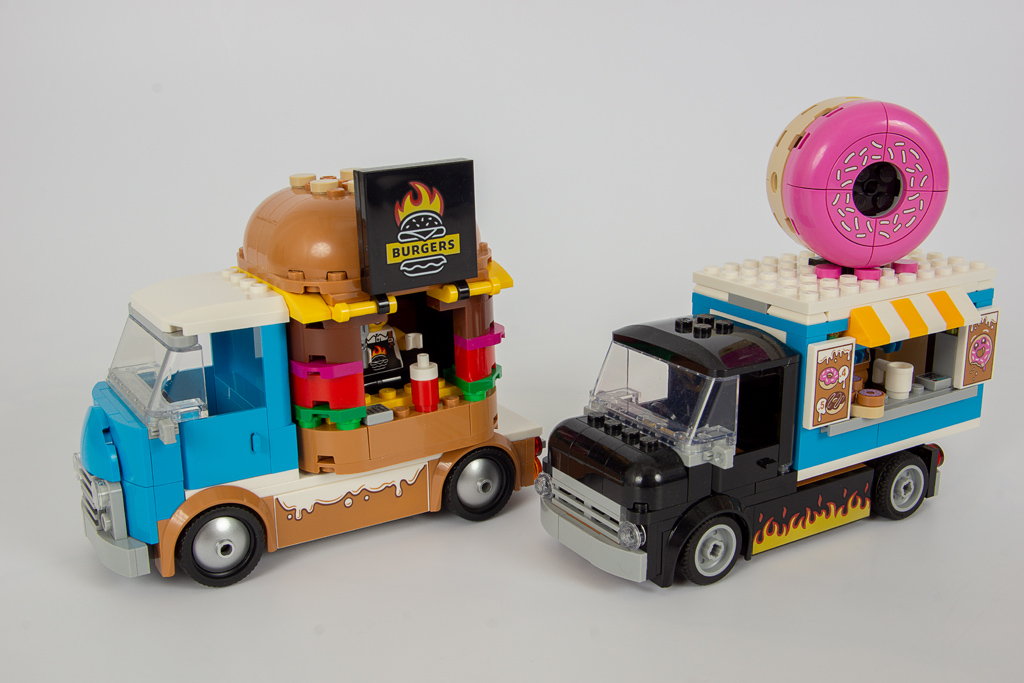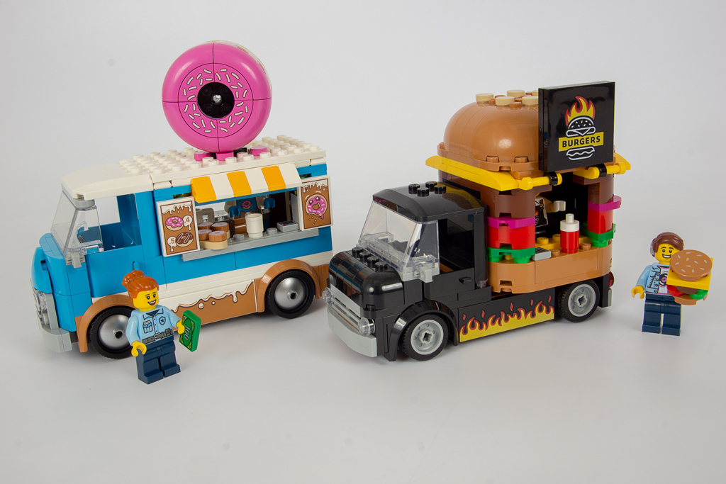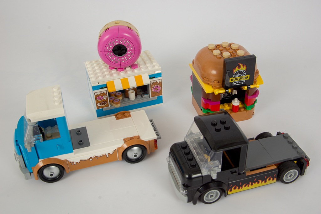 Und, wie oben angekündigt, lassen sich die Verkaufsstände zwischen dem Donut- und dem Burger-Truck (60404) tauschen. Leider passen ihre Längen nicht zusammen, und der Donut-Stand wirkt, wenn er alleine steht, auch einfach zu klein. Im direkten Vergleich gewinnt also der Burger-Truck. Burger sind ja auch viel gesünder als Donuts. (Sind sie?)