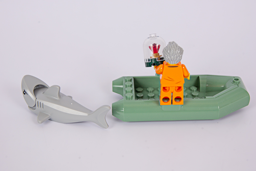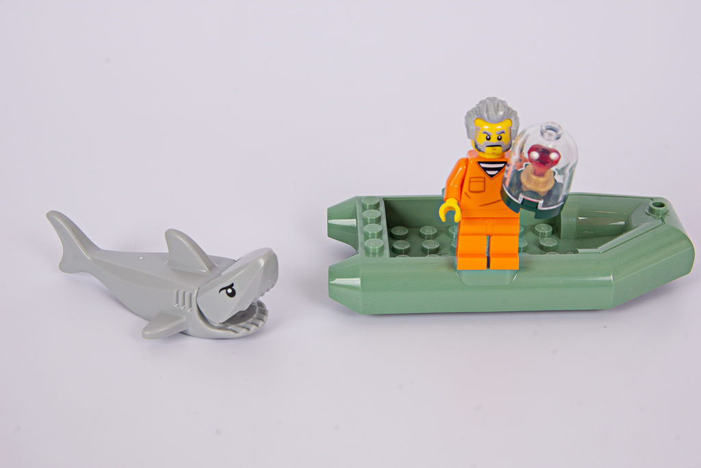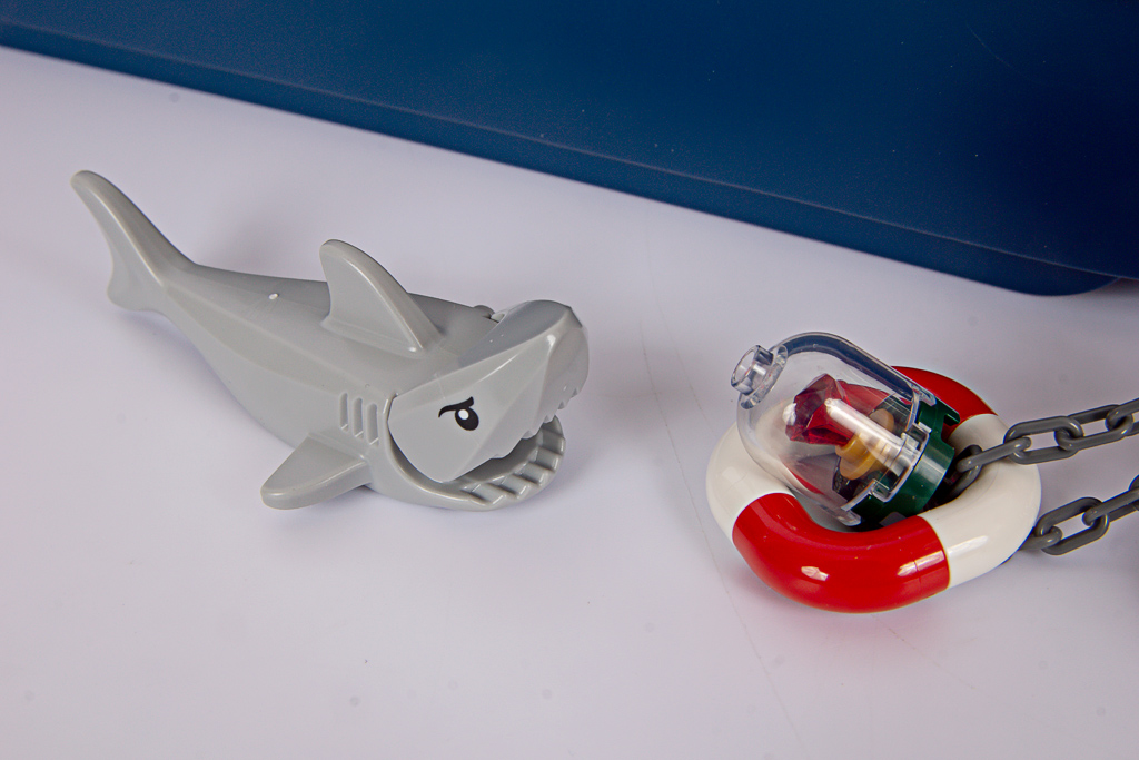 Einerseits freue ich mich, wenn in Sets Tiere enthalten sind (was, seit Chris Stamp Design Lead bei City ist, selten genug wurde – die Sets sind nun so großartig, dass es keiner Tiere mehr als Verkaufsargument zu bedürfen scheint), hier ein Hai. Leider ist in so ziemlich jedem Meeres-Set inzwischen genau dieser Hai enthalten, mal in Hellgrau, mal in Dunkelgrau. Ich wünsche mir hier wirklich mal etwas Abwechslung, gerade den Wunsch nach einem Babyhai habe ich schon mehrfach geäußert.