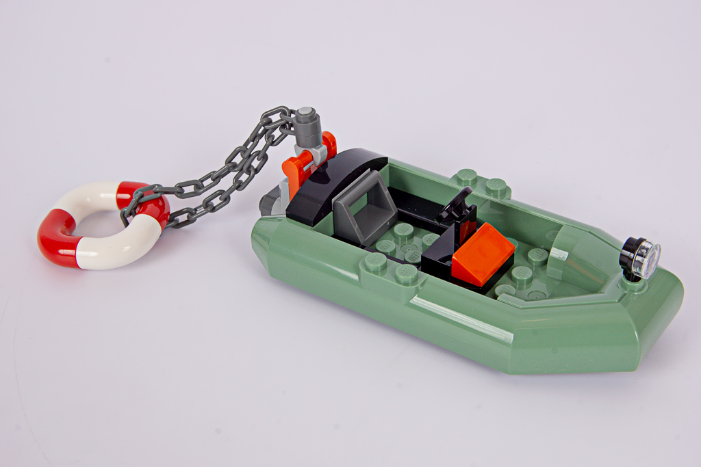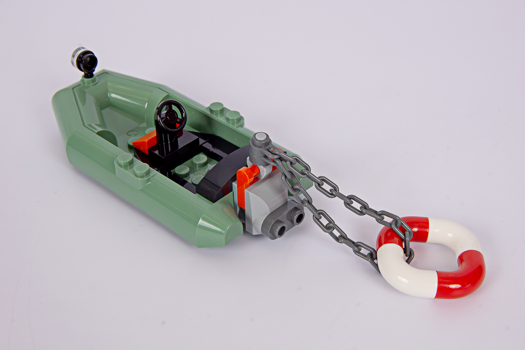 Eines der kleinen Schlauchboote (78611, hier neu in Sand Green), die auf der Gefängnisinsel eben so herumliegen, dient dem Knastbruder als Fluchtmittel. Ein schön gebauter Schwimmring ist am Motor befestigt, damit der Hai sich retten kann, wenn er sich am Flüchtling delektiert hat. Es heißt ja, Orange sei eine Warnfarbe, giftig und so. Das weiß der Hai aber nicht…