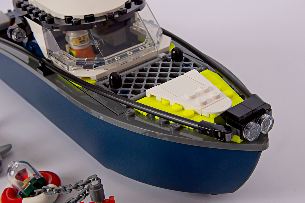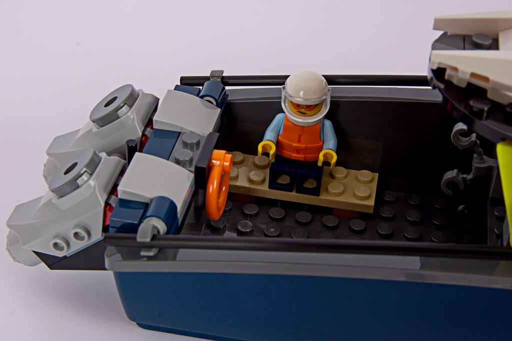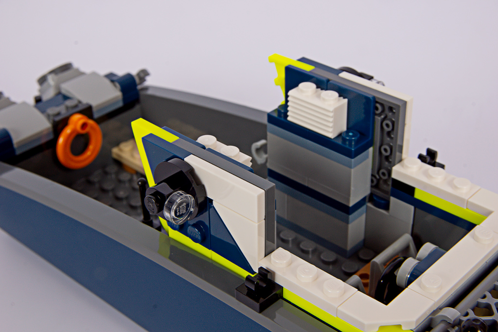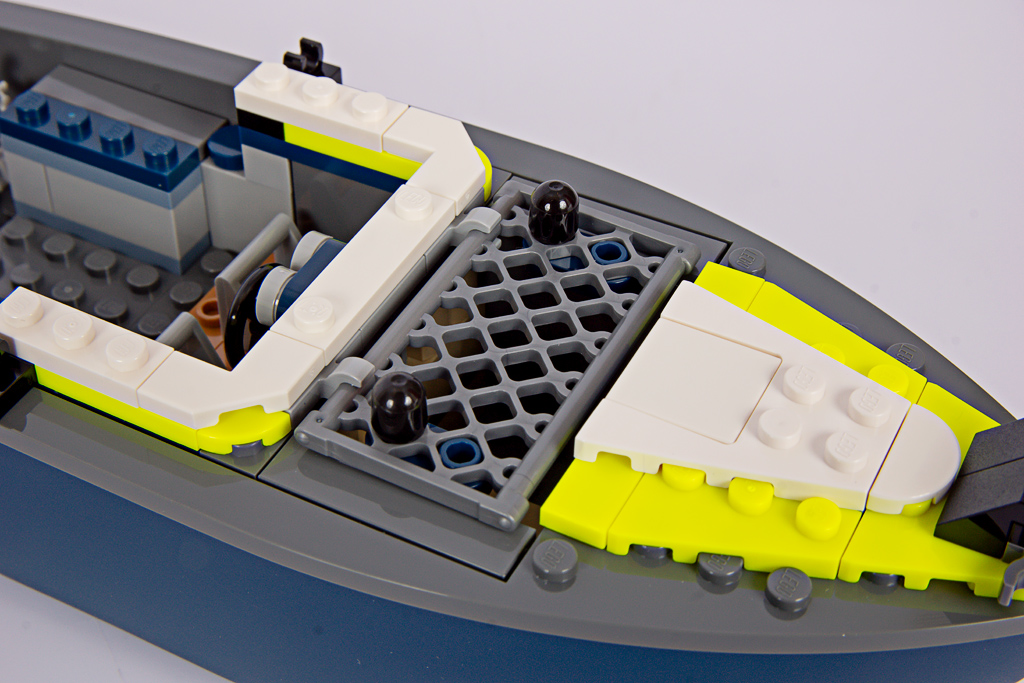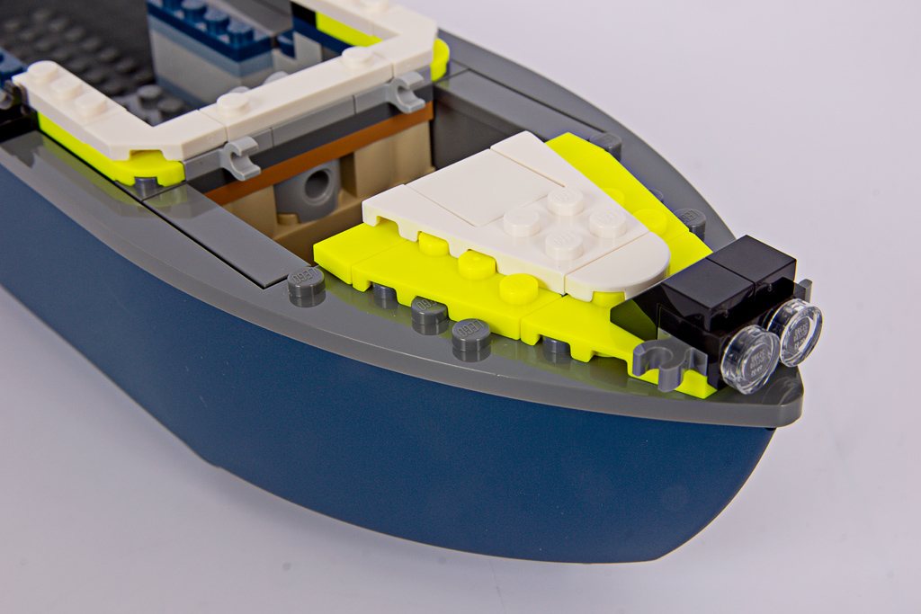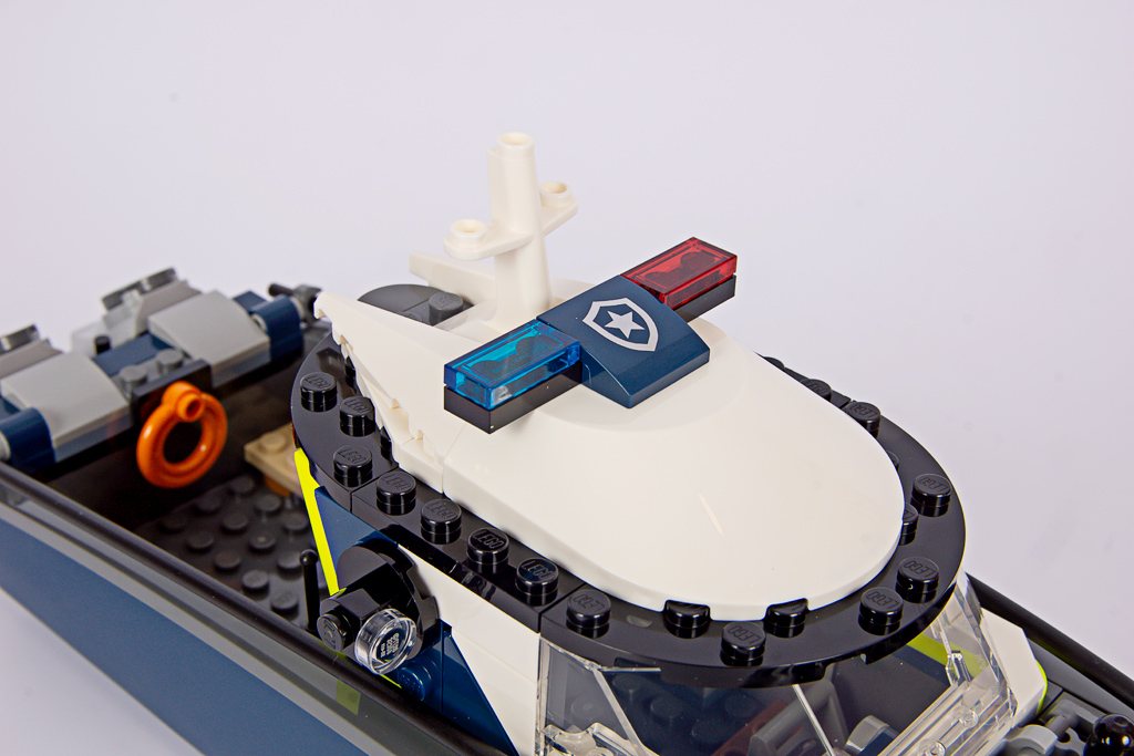 Das Polizeiboot verfügt über einen zweiteiligen, schwimmfähigen Rumpf (6924c01), der neu für das Set entwickelt wurde. Mit 34 Noppen Länge ist er beinahe so lang wie das Containerschiff im 60422 Hafen mit Frachtschiff! Eine Nummer kleiner hätte hier wirklich nicht geschadet. Davon abgesehen, gefällt mir die Form des Rumpfes gut, besonders der geschwungene Übergang zum Heck.