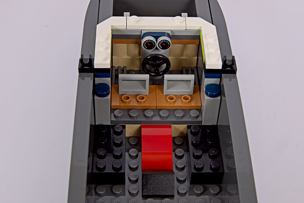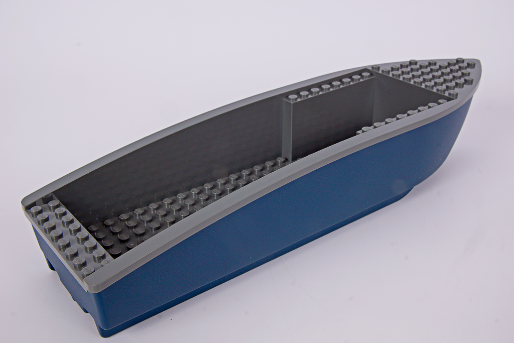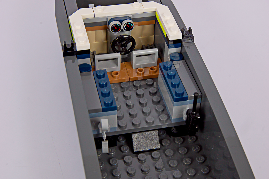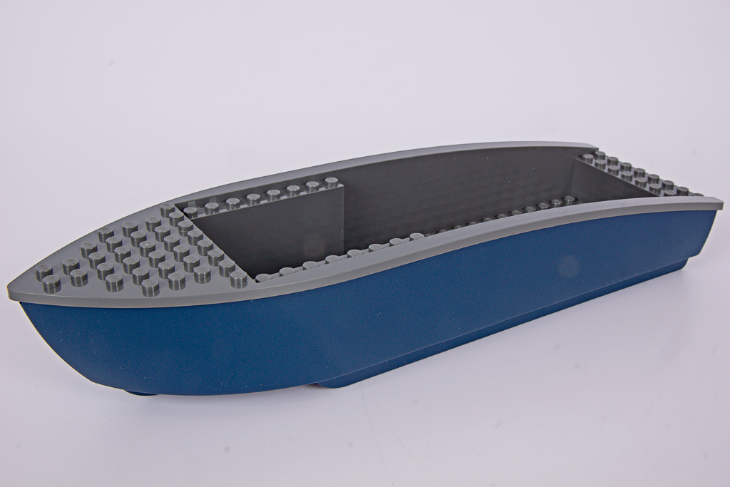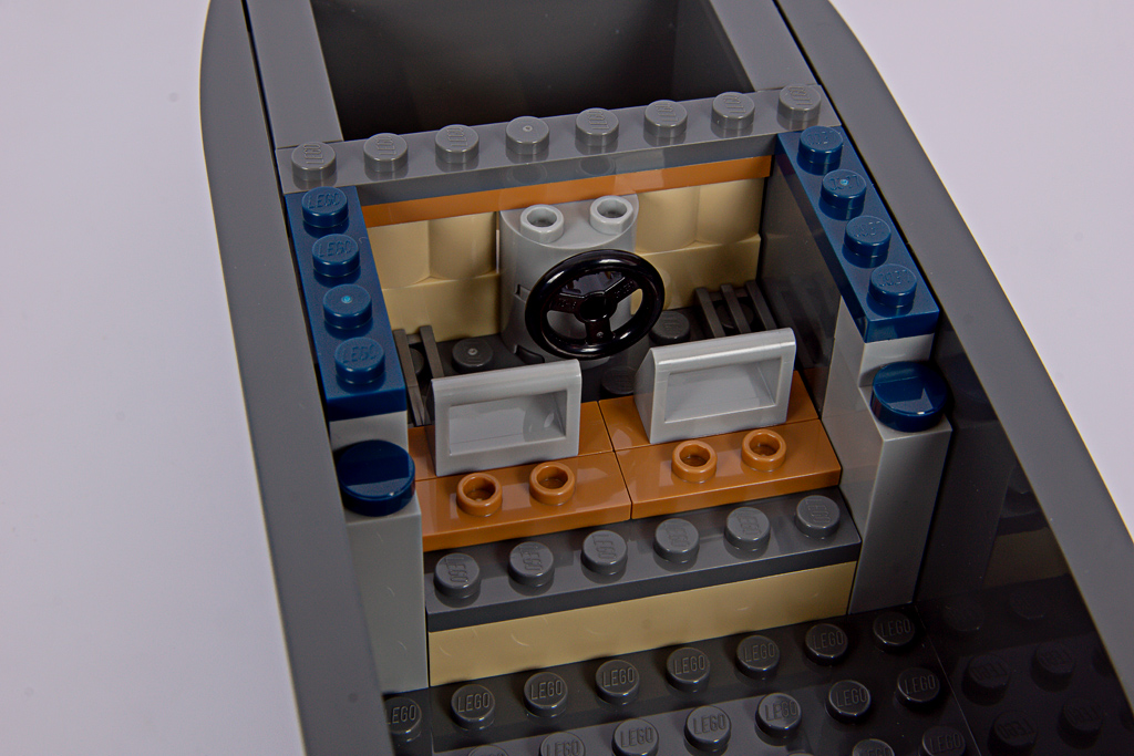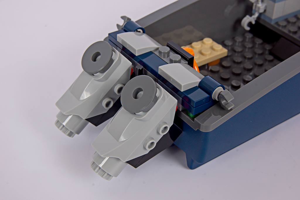 Das Polizeiboot verfügt über einen zweiteiligen, schwimmfähigen Rumpf (6924c01), der neu für das Set entwickelt wurde. Mit 34 Noppen Länge ist er beinahe so lang wie das Containerschiff im 60422 Hafen mit Frachtschiff! Eine Nummer kleiner hätte hier wirklich nicht geschadet. Davon abgesehen, gefällt mir die Form des Rumpfes gut, besonders der geschwungene Übergang zum Heck.