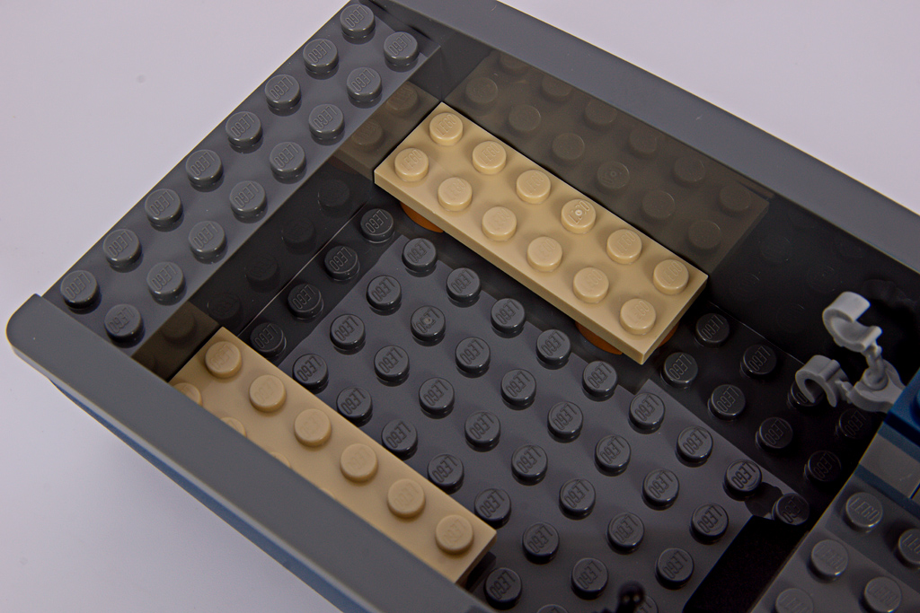 Der Raum im Bug soll laut Produktbeschreibung eine Zelle sein, ist für mich aber nur ein Stauraum. Zur Abdeckung wird eines der 2024 neu eingeführten Maschendrahtzaun-Elemente (5032) genutzt. Schöne Idee!