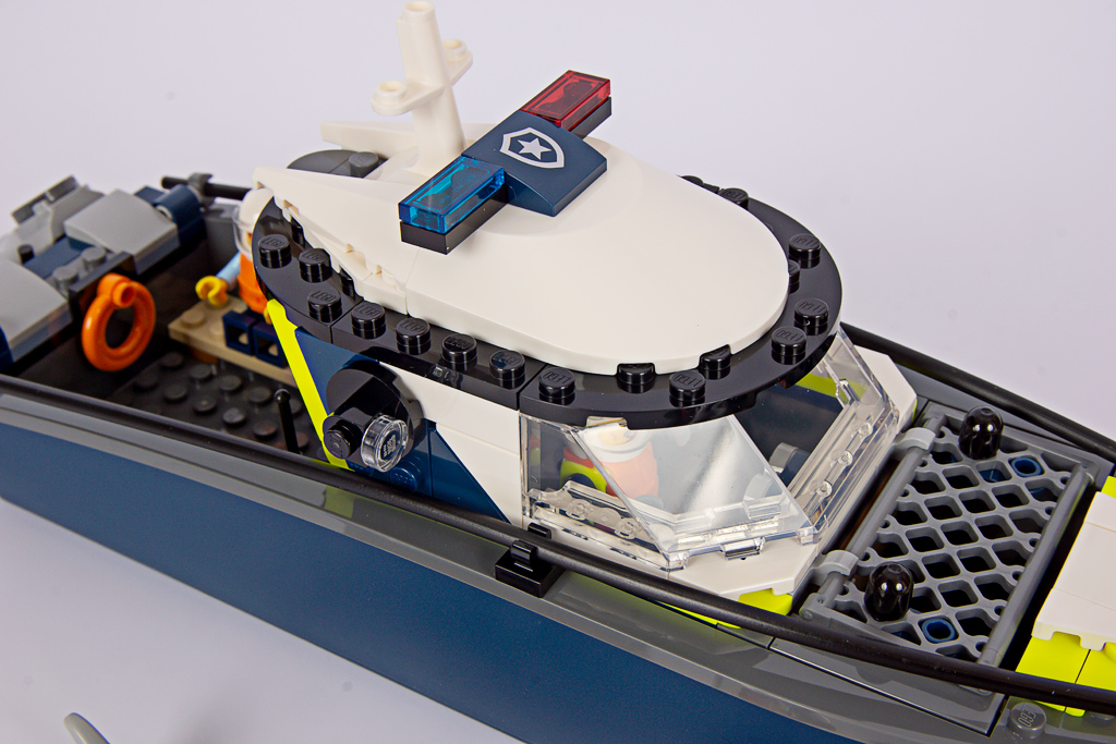 Und auch das Dach, das vorn mit einer weißen Windschutzscheibe (3383) abgerundet wurde, gefällt mir. Nur: Die Positionslichter fehlen! Es sind zwar ein rotes und ein grünes Licht in die Wände eingebaut, diese sieht man aber kaum mehr, und das weiße Topplicht fehlt komplett. Stattdessen haben wir die seit 2024 blauen und roten Blaulichter, zwischen denen ein neu bedruckter Curved Slope (15068pb611) den Besitzer des Polizeibootes anzeigt. Eben die Polizei. Logisch. Nach hinten wird das Dach mit noch recht neuen Wedges (3504/3505) abgeschlossen, was mir hervorragend gefällt. Dies schließt dann den Aufbau ab.