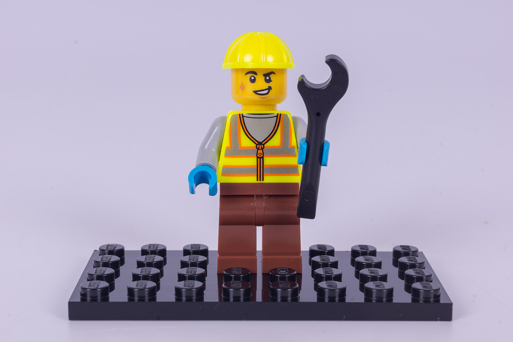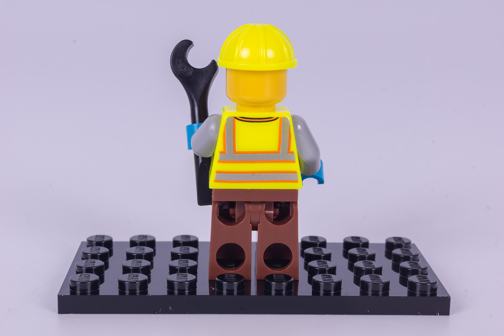 Gefahren sind sein Metier! Denn schließlich hat er das Servicefahrzeug gefahren. Der Arbeiter (cty1924) trägt die seit 2022 für seinesgleichen übliche Warnweste (973pb4658c01) und einen Schutzhelm (3833) in Neongelb. Zwar sind die Teile nichts Besonderes mehr, die Figur gefällt mir aber.