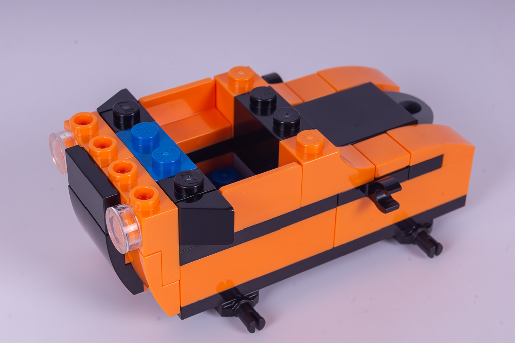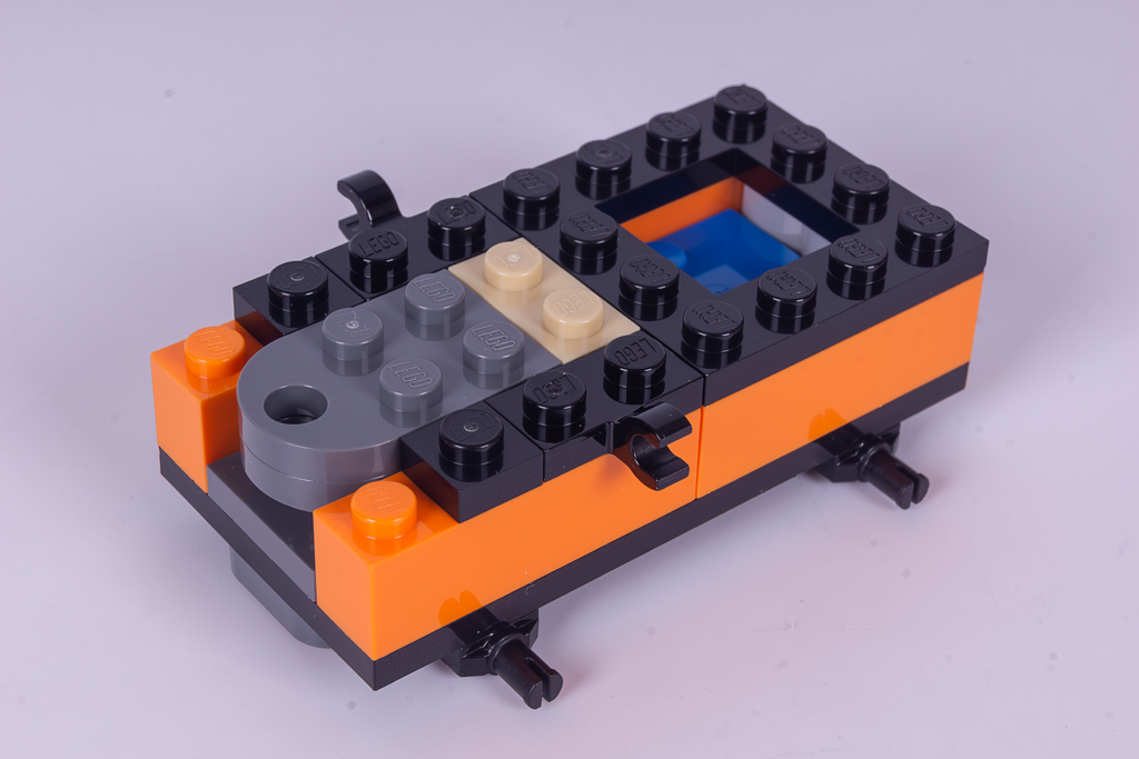 Das Servicefahrzeug ist minimalistisch klein und vorwiegend in Orange und Schwarz gehalten. Vorn haben wir ein winziges Führerhaus, hinten den Motorblock.