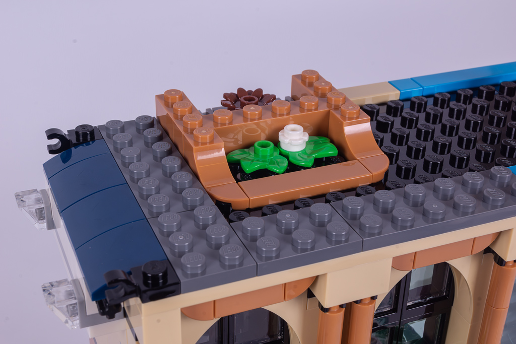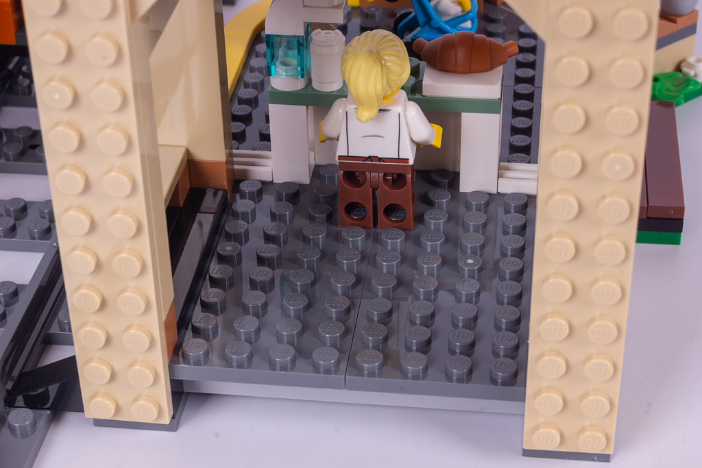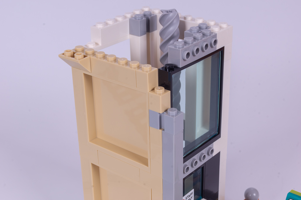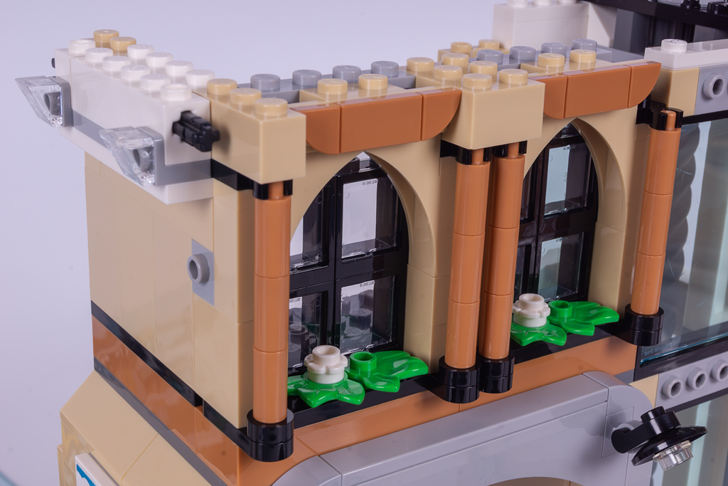 Zum Schluss haben wir ein doch ansehnliches Gebäude mit gelungenem Außenbereich und einigen Details. Die Ansicht der Rückseite offenbart da aber deutliche Mängel, insbesondere die angeklatschten 2 x 16-Platten in Tan (4282) rechts. Diese dienen auch nicht der Stabilisierung, sodass ich nicht verstehe, wie man sie da anbringen konnte. Außerdem steht das Gebäude dadurch hinten über, kann also nicht bündig an eine Wand geschoben werden – wofür es aber eindeutig designt wurde.