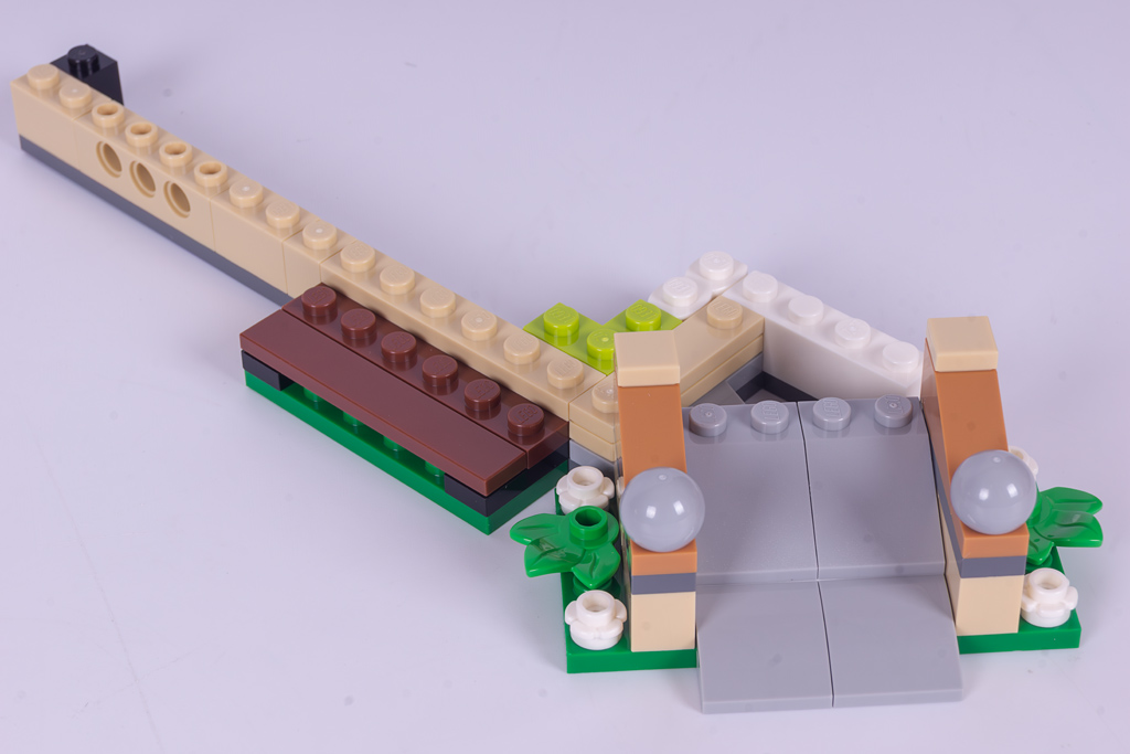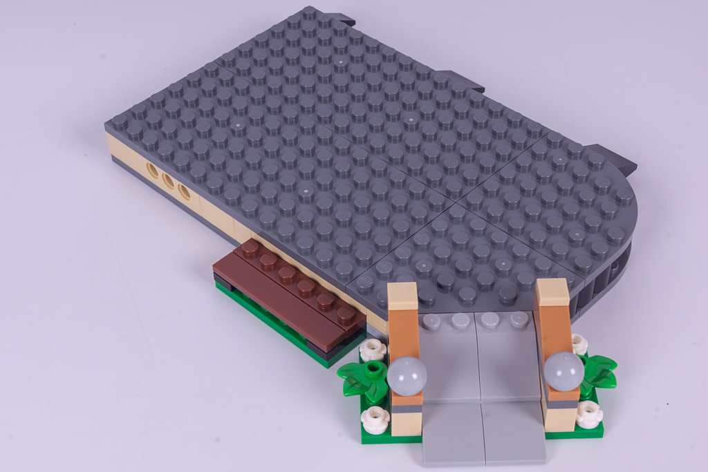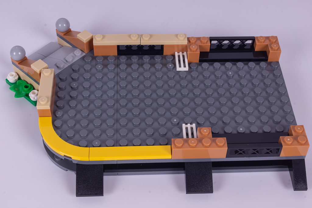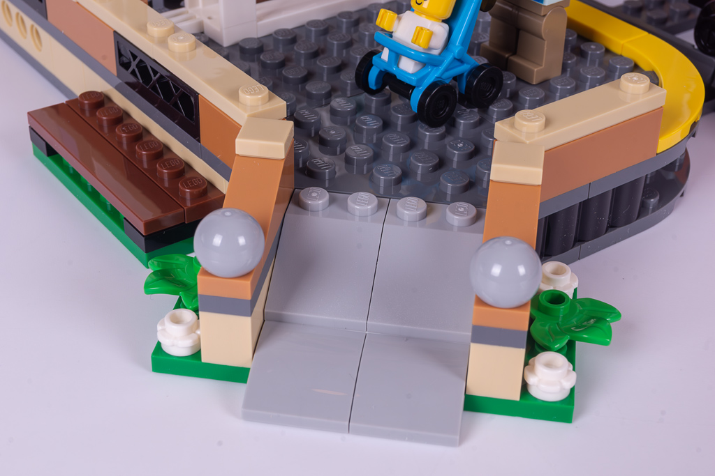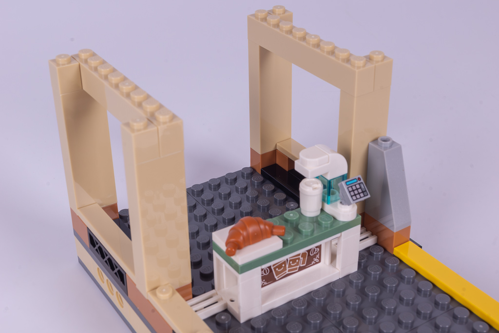 Zum Schluss haben wir ein doch ansehnliches Gebäude mit gelungenem Außenbereich und einigen Details. Die Ansicht der Rückseite offenbart da aber deutliche Mängel, insbesondere die angeklatschten 2 x 16-Platten in Tan (4282) rechts. Diese dienen auch nicht der Stabilisierung, sodass ich nicht verstehe, wie man sie da anbringen konnte. Außerdem steht das Gebäude dadurch hinten über, kann also nicht bündig an eine Wand geschoben werden – wofür es aber eindeutig designt wurde.
